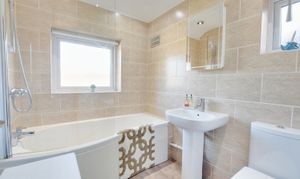 With double glazed windows to the rear and side elevations, bath with shower over, low-level WC, pedestal wash hand basin, extractor fan, tiled walls, part tiled walls, heated chrome towel rail.