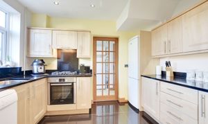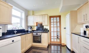 With double glazed window to the rear elevation, sink and drainer unit, wall and base units with work surface over, built-in oven and gas hob with filter hood over, plumbing for dishwasher, tiled floor.