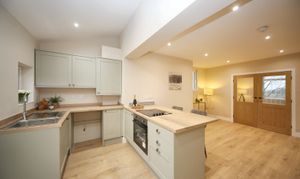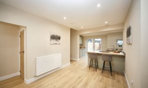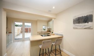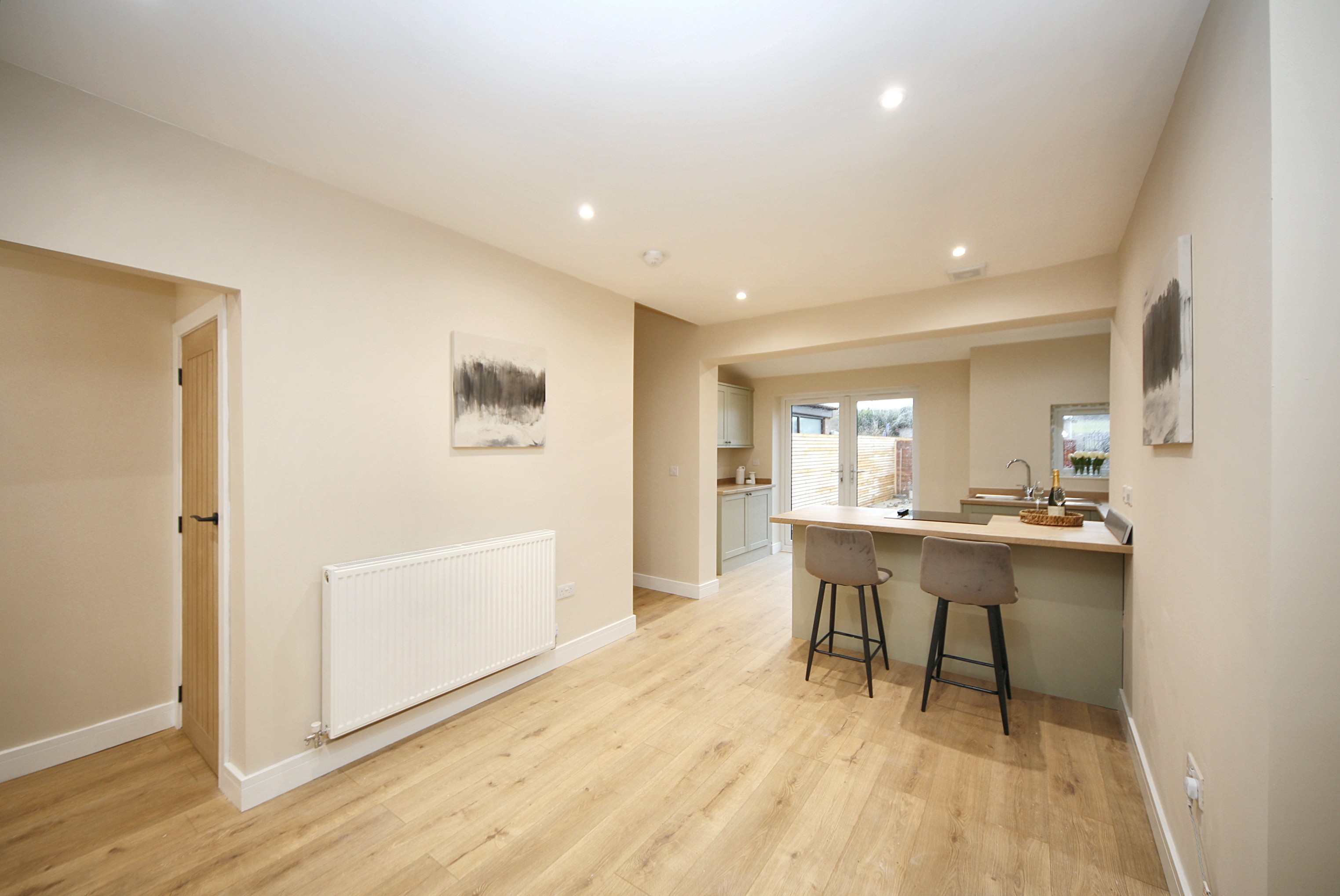 - Lounge with double doors opening to an open-plan kitchen diner with breakfast bar