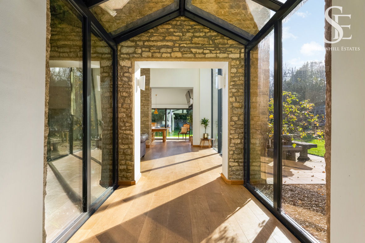 For now, continue ahead and left, leaving behind the warm, intimate feel of the entrance hall for a light-washed, full glass atrium, leading on to the soaring ceiling heights of the expansive, open plan kitchen-diner.
