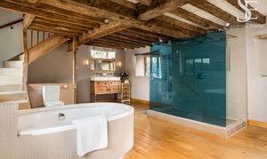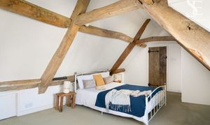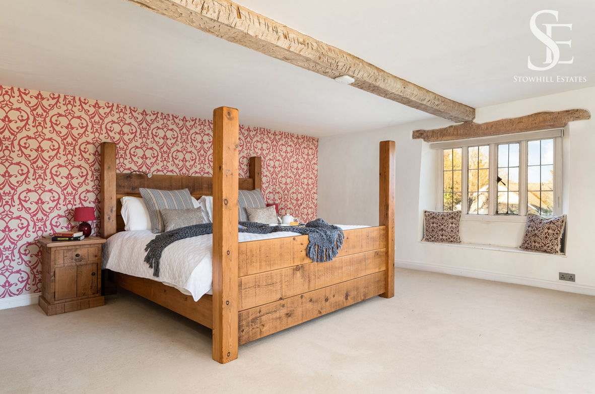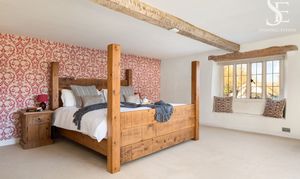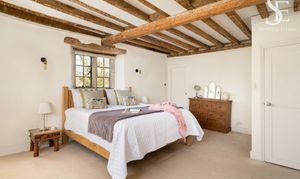 Turning left, seek sanctuary in the comfort and period charm of the principal bedroom, which retains its original exposed beam and fireplace. Window seats provide a point to pause and admire the garden from the main bedroom, yet the showpiece here is the en suite: a broad walk-through shower and a modern oval bath, halo-lit at its base and set beneath the heavy, timeworn beams, and against the backdrop of the exposed fireplace - a standout meeting of classic structure and contemporary design.