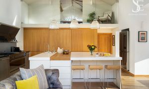 Full height wooden cabinetry lifts the eye to a glass balcony above, with robust timber beams, naturally aged, in an A frame to the centre of the room. Share a glass of wine with the chef at the breakfast bar central island or prepare meals whilst watching the children play safely in the enclosed back garden through the glass doors, which slide easily open for al fresco dining in summer.