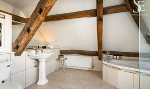 The main landing also leads right, to arrive at a large double bedroom, with classic beams overhead and a feature fireplace. This bedroom offers access to a Jack ‘n’ Jill bathroom containing bath with shower over.