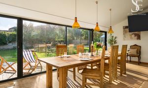 Balancing perfectly the easy-living functionality of contemporary design with the classic farmhouse feel of its origins, a tall stone chimney breast features a double-sided log-burning stove, issuing warmth to both the seating area and dining area.