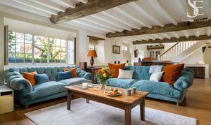 The same cosy, cocooning atmosphere flows into the living room next door, a snug counterpoint to the home’s larger spaces, where a vast stone fireplace and log-burning stove issue warmth and welcome. Low beams overhead add to the comfort, while in summertime doors on both sides open to the garden.