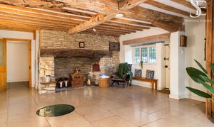 Stepping through the front door, the period character of the entrance hallway presents itself instantly in the wall of exposed stone, rustic beams, wide latched wooden doors and window seats. Stealing the show, the deep inglenook fireplace on the right, with its bread oven , epitomises the essence of the home. Modern, creamy limestone flooring flows underfoot, with the glazed eye of the now-covered well set directly ahead.