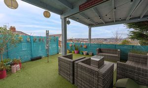 Stepping outside we have the magnificent rear garden, which features a multi-levelled terrace blended with low maintenance turf and an abundance of seated patio areas, offering plenty of flexible outdoor space for residents to enjoy. At the summit of the garden we can find a sheltered lounge space, which is ideal for entertaining guests and enjoying al-fresco dining, with a scenic views of the surrounding cityscape providing a relaxing backdrop to this wonderful space. The garden also features a large summerhouse / shed providing versatility and potential for a wide range of functions, such as a home bar or an outdoor games room. Additional outdoor space is present at the front of the house, with a pebble stone garden accessed from the street below, where on-road parking is available.
