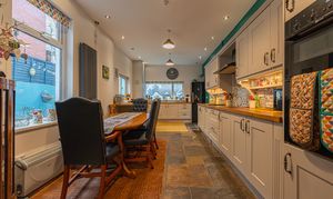 We enter this incredible Victorian-era family home to the front, which is beautifully presented throughout, showcasing a blend of period features with contemporary style, starting with the large entry hall. The ground floor features two spacious reception rooms, offering considerable flexibility for residents, which are both ideally suited for relaxing, dining or welcome guests. Both rooms are both flooded by natural light, with the front facing room lounge enjoying glorious bay windows, and the neighbouring family room offers a doorway directly in the garden. To the rear of the home we have the kitchen, which features an impressive open plan design to double up as the dining room, also enjoying a great amount of natural light and a vibrant design, with stone flooring, wooden counter tops and sleek cabinetry throughout. The kitchen benefits from ample storage options and plenty of counter space, as well as space to entertain visitors. From the hallway we can find a W.C and useful cloakroom space, before ascending to the first floor.