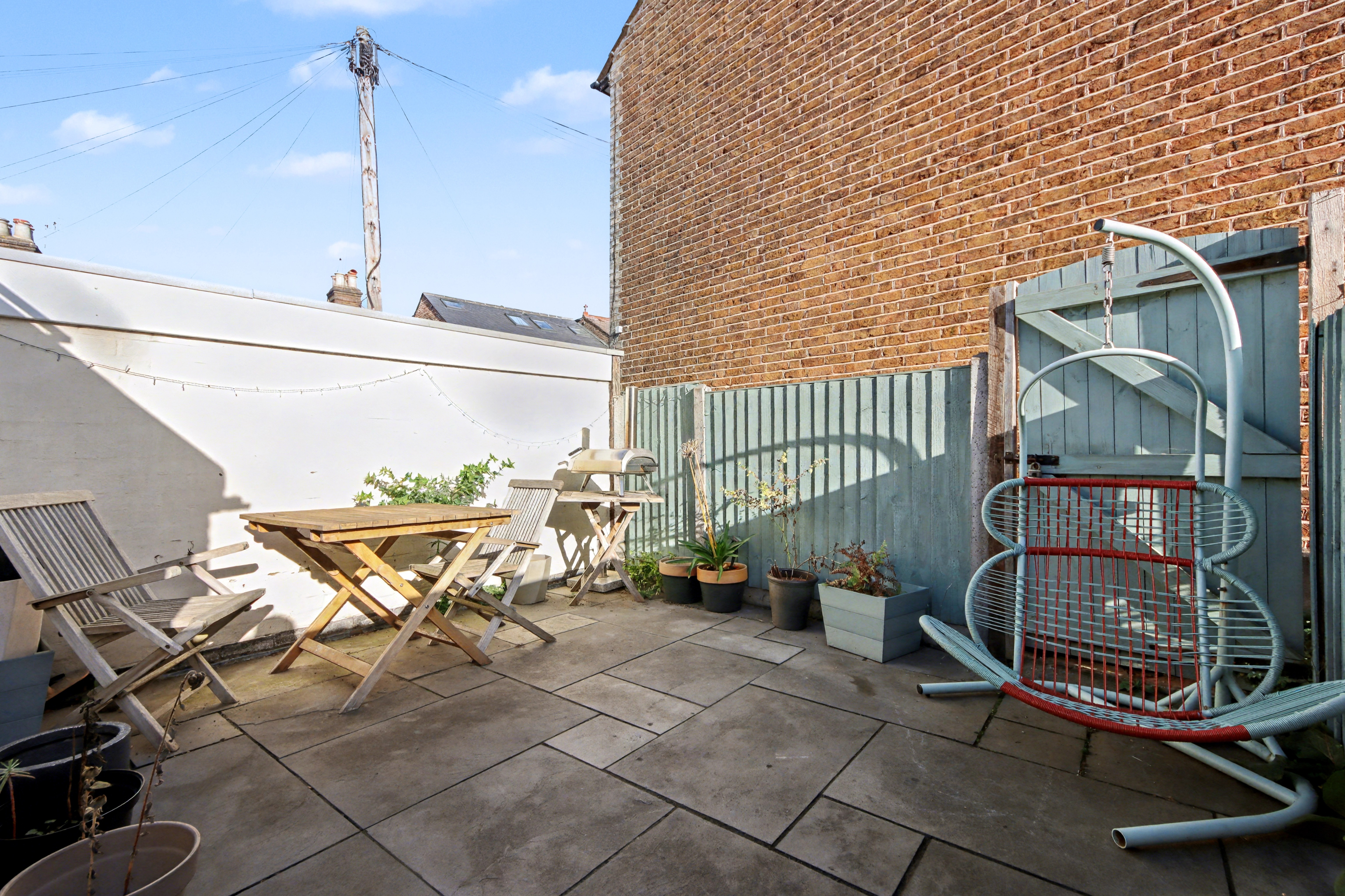 To the rear, the easterly facing garden feels almost courtyard-like in its simplicity, extending neatly from the house and offering a peaceful outdoor space to unwind.
