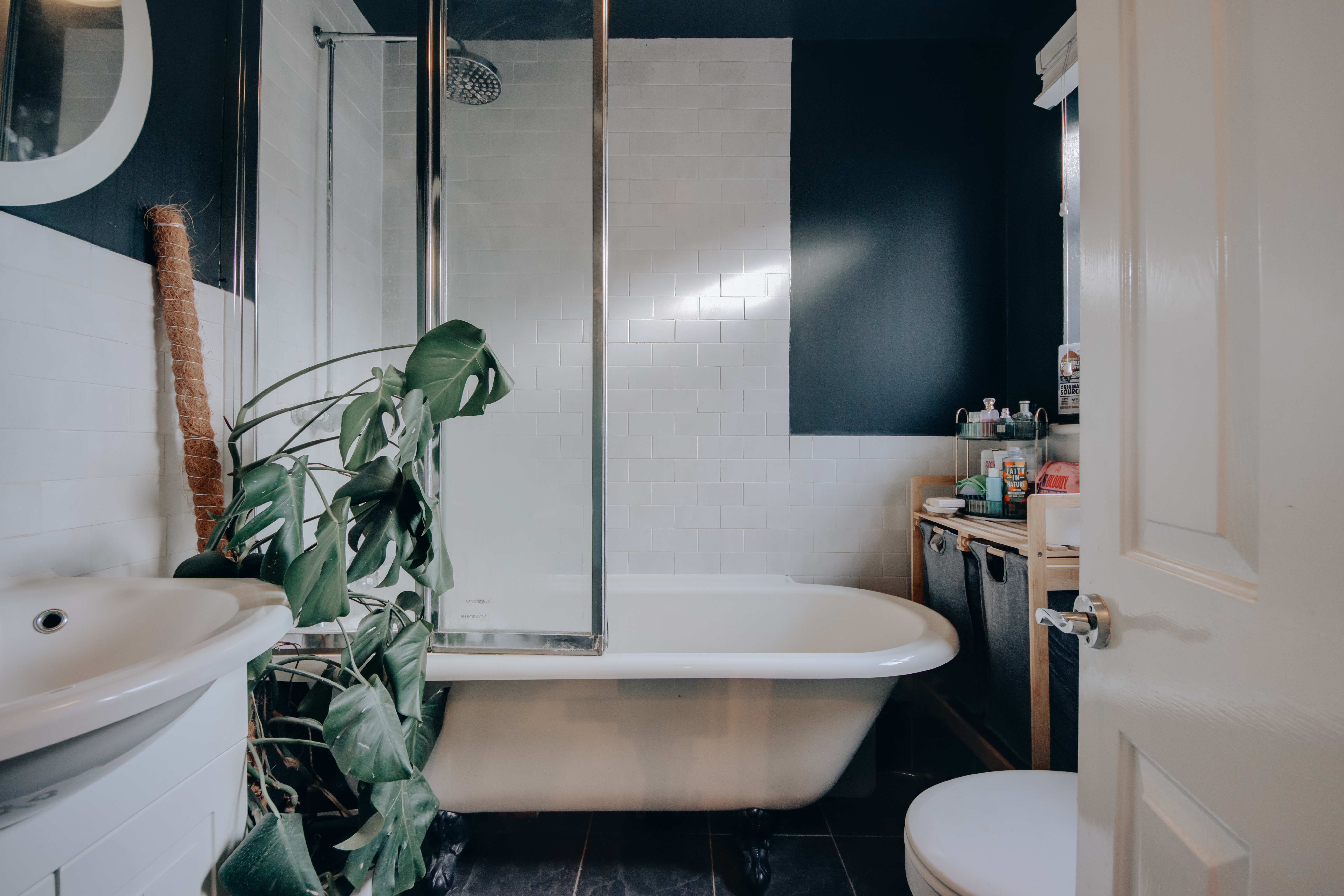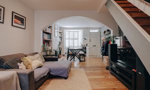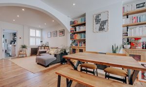 Through the anthracite front door, the ground floor opens into an impressive living and dining space measuring 24’10” x 11’7”. Original floorboards have been renewed, adding both heritage and softness underfoot. A rare architectural feature defines the room: an elegant arched opening between the living and dining areas, creating a gentle flow you don’t often find in Victorian homes. The fireplace forms the natural focal point, flanked by bespoke alcove cabinetry where curated books and objects bring texture and colour in that quietly styled, editorial way. The galley kitchen sits at the rear, fitted with a full run of cabinetry and well-arranged appliances for everyday ease. Beyond this lies the ground floor family bathroom, finished in a deep navy with white tile slips, complete with a freestanding tub and separate enclosed shower - a calm, contemporary retreat.