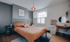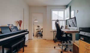 Upstairs, the first floor offers two bedrooms. The main room is bright and generous, framed by a west-facing sash window that fills the space with afternoon light and provides ample room for freestanding furniture. The second bedroom leads to an unexpected and rare addition: a separate study. Currently used as a dressing area and drum room, it’s an ideal flexible space for home working or creative pursuits.