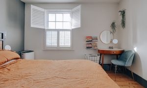 - Neutral painted brick façade with bay window, sash windows and shutters.