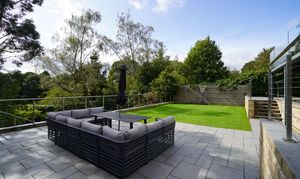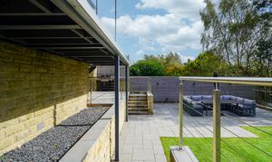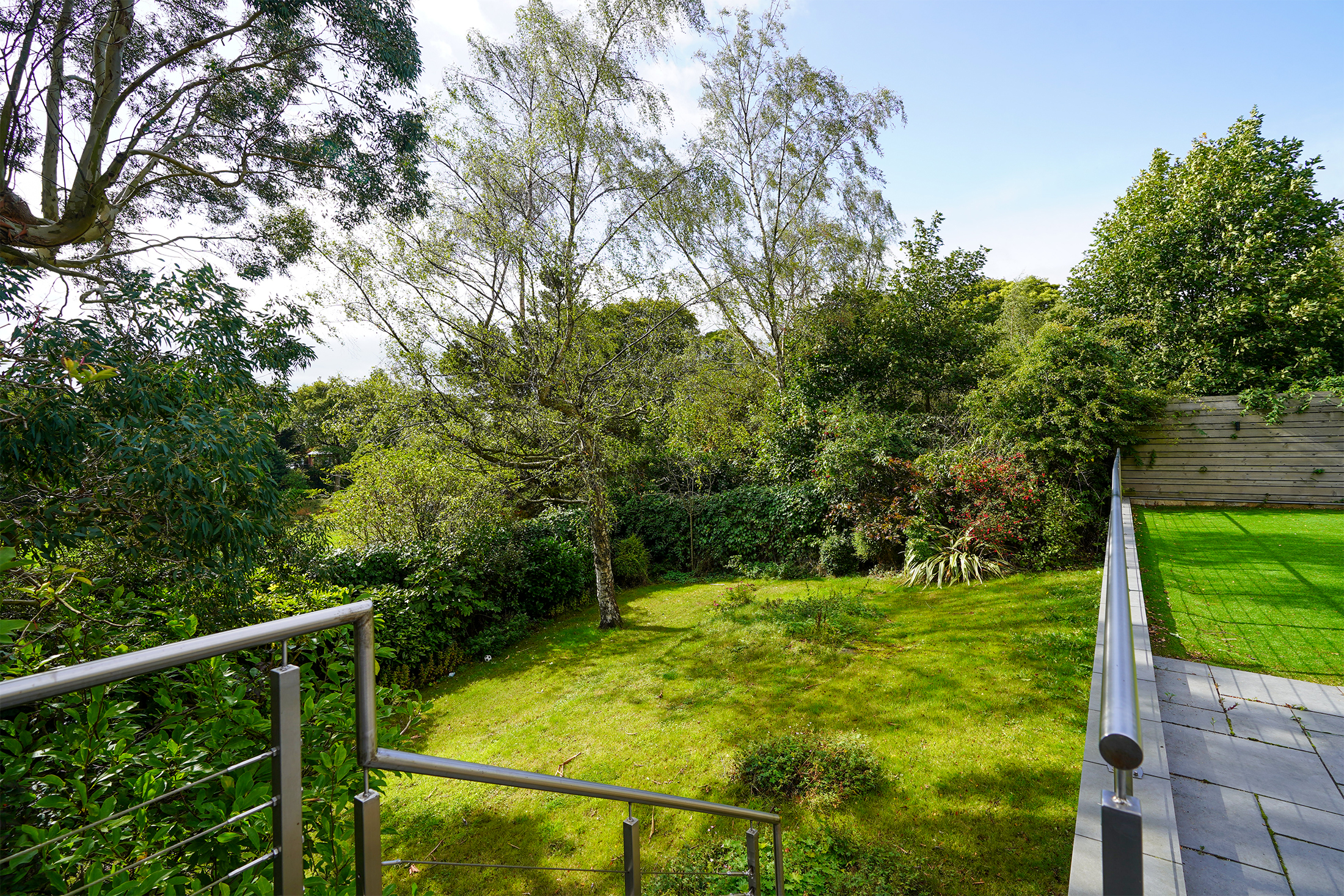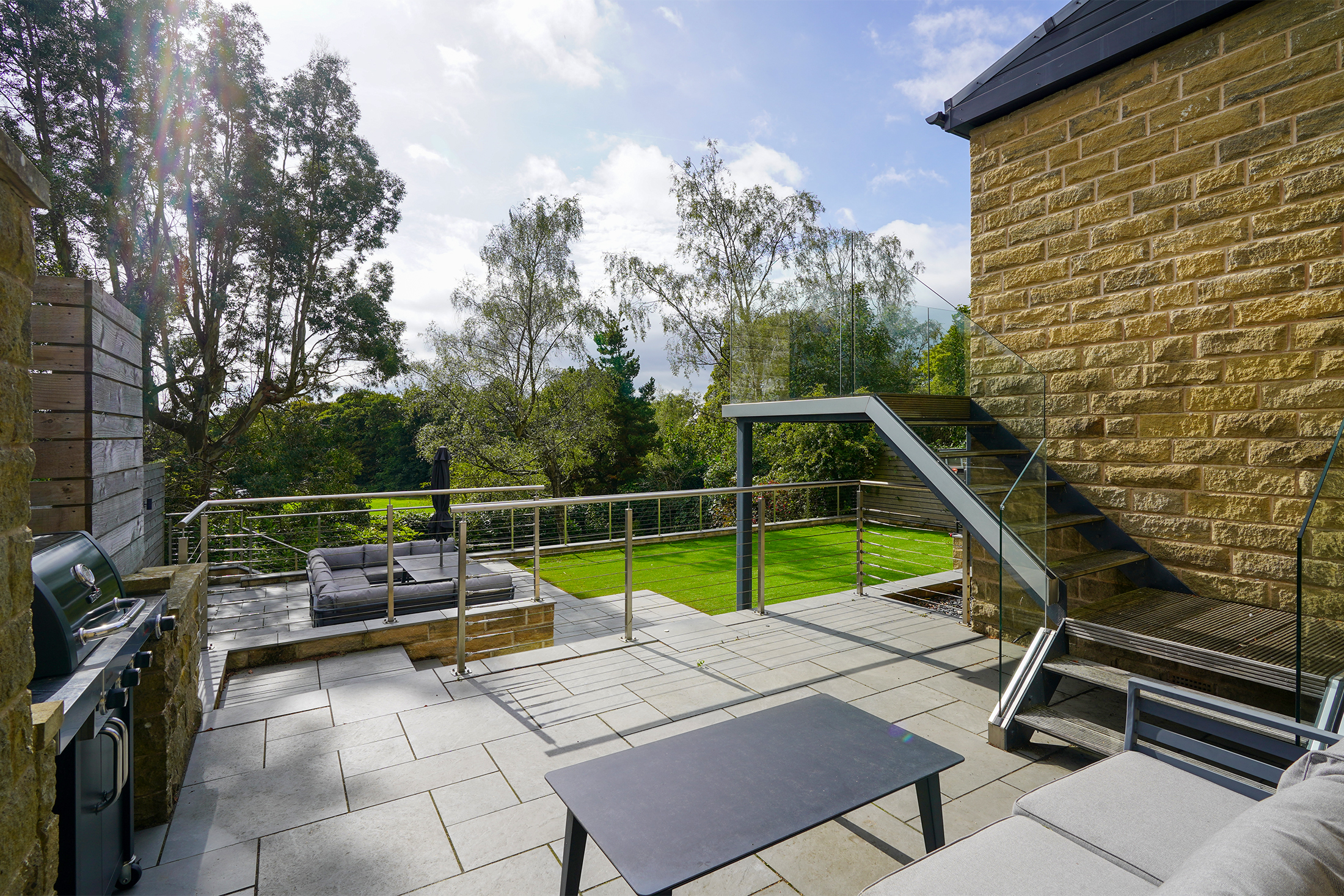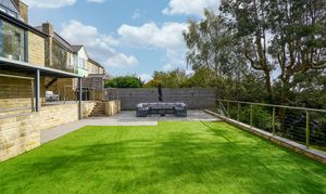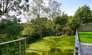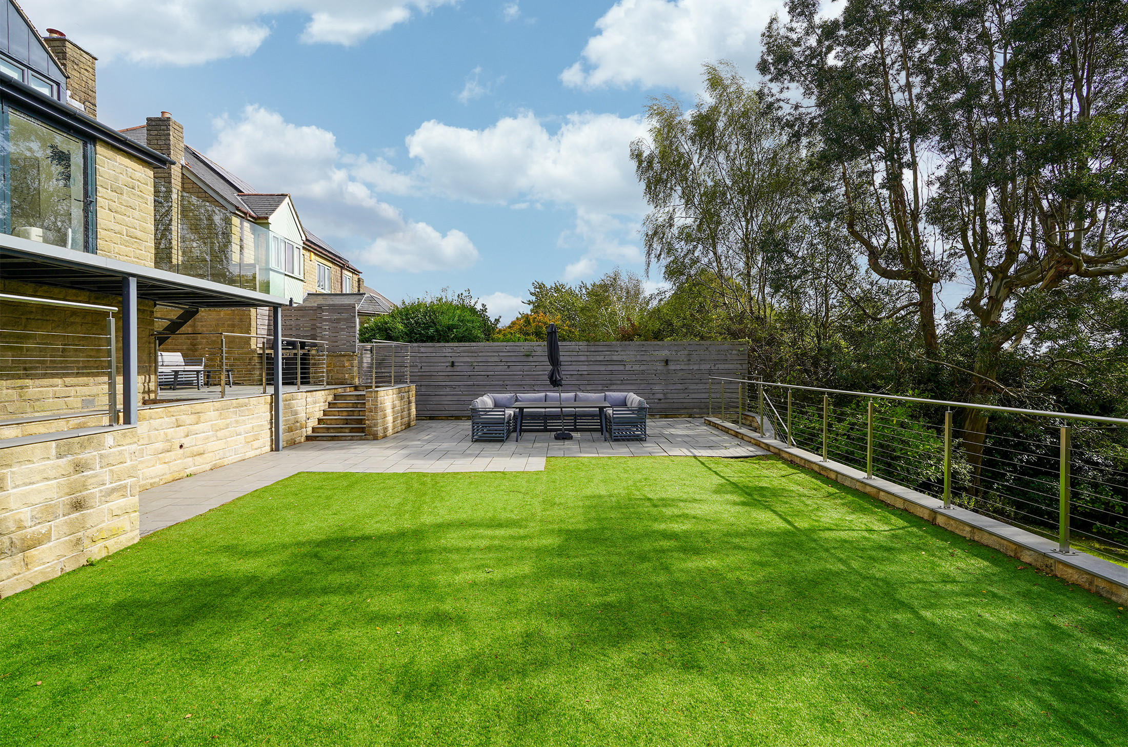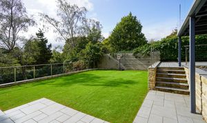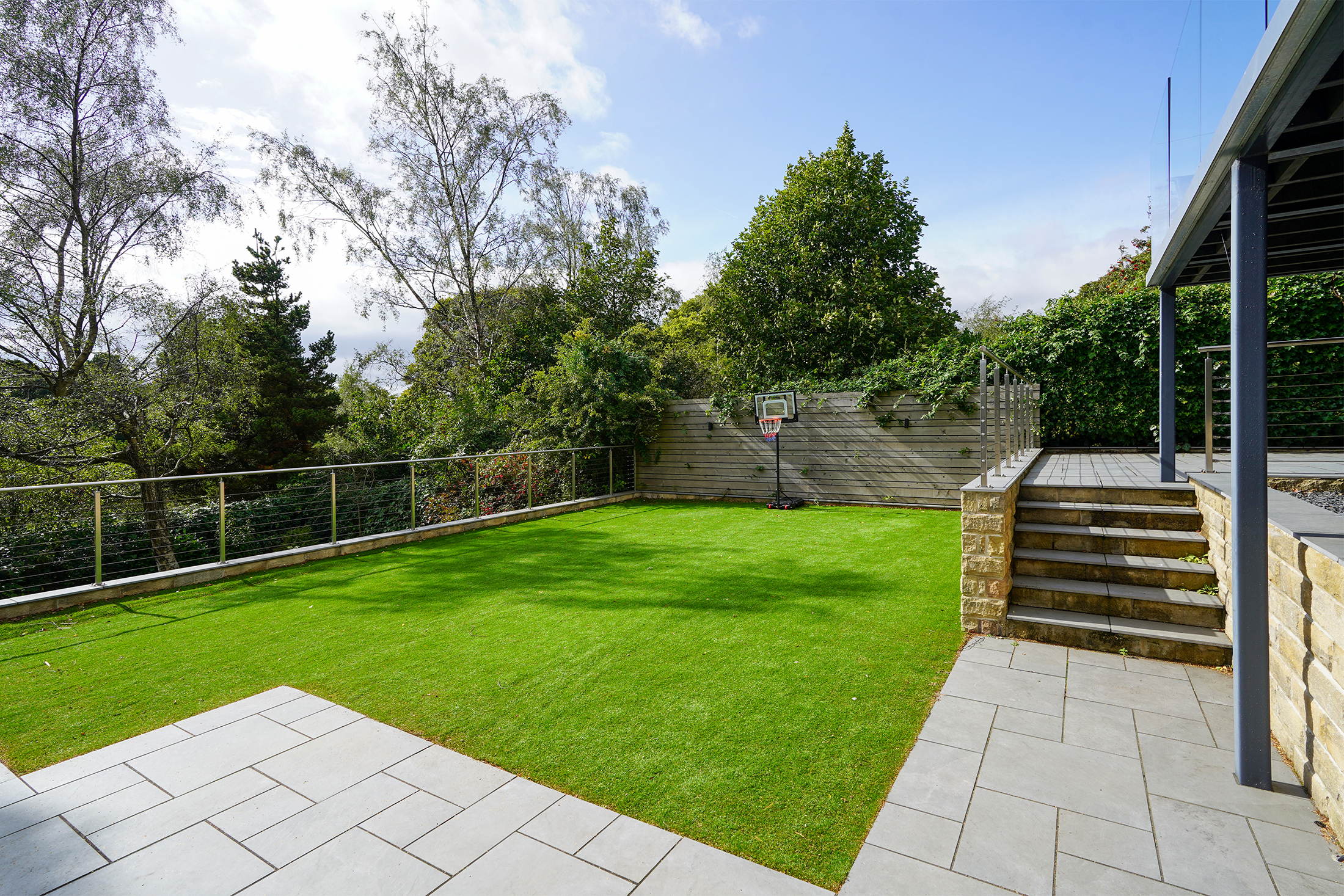 Low maintenance garden with decked terrace & glass balustrade, paved patio, artificial lawn and steps down to mature garden.
