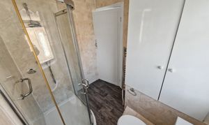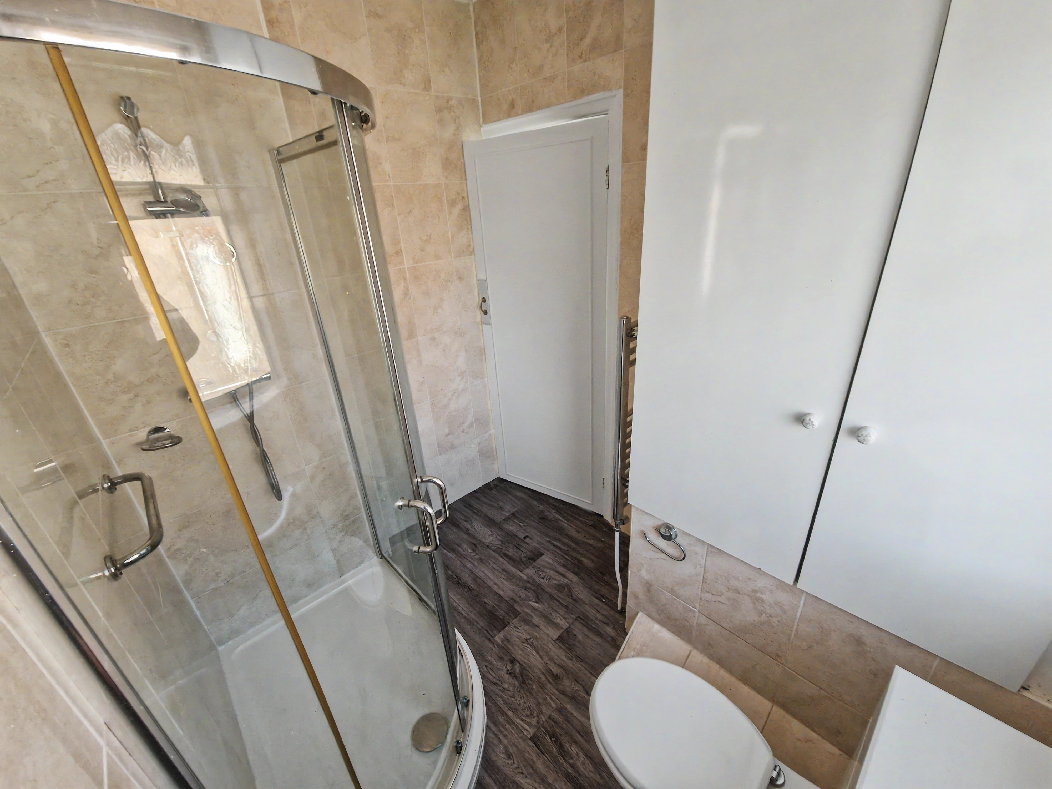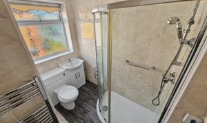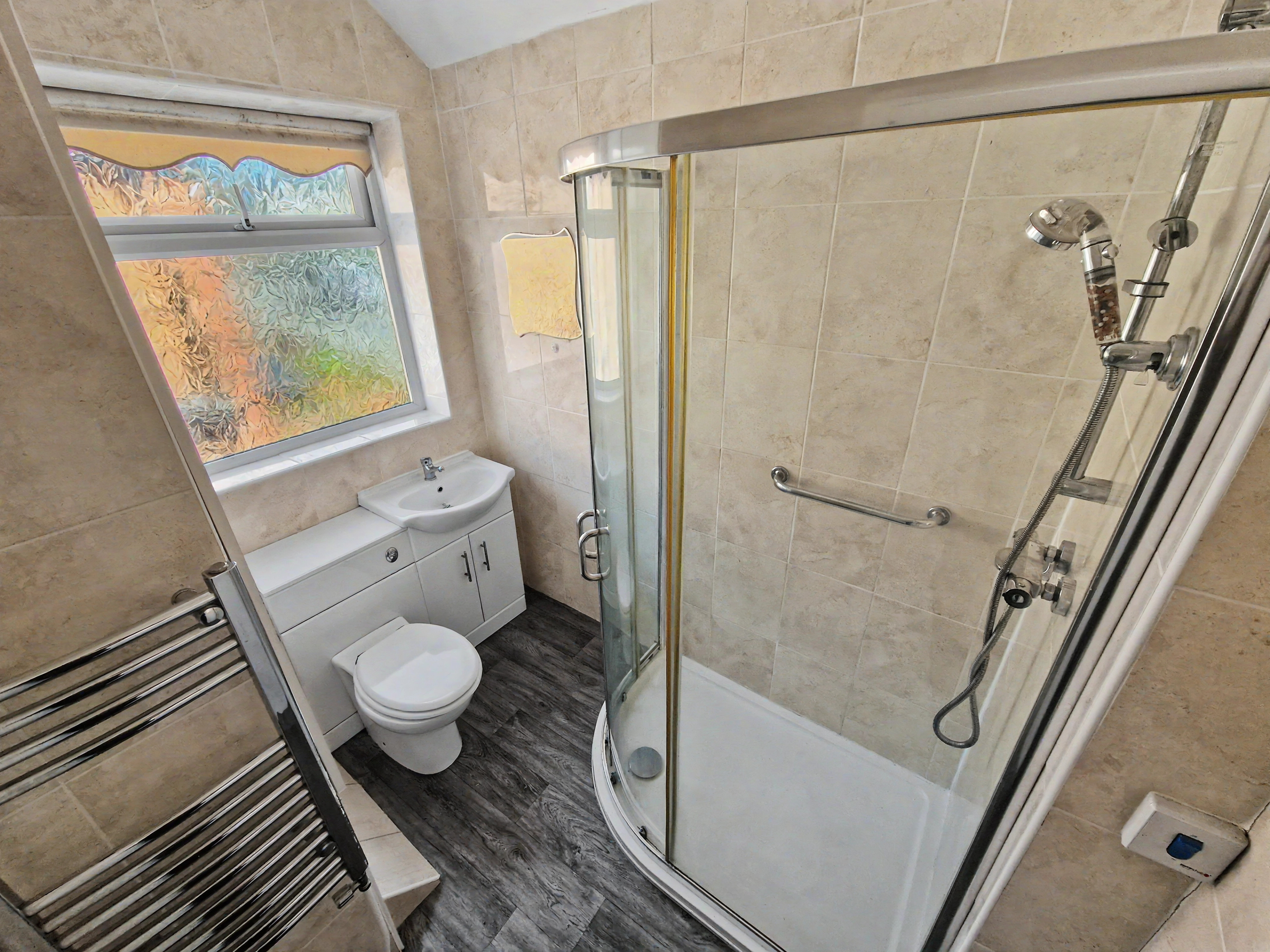 To the first floor, the landing leads to three bedrooms. The master bedroom is a generous double located at the front of the property, while the second bedroom is another good-sized double overlooking the rear. The third bedroom is a single/box room, benefiting from built-in storage or wardrobe space. The main shower room features a walk-in shower, is fully tiled, and includes a wash basin, WC, heated towel rail, and additional storage.