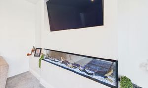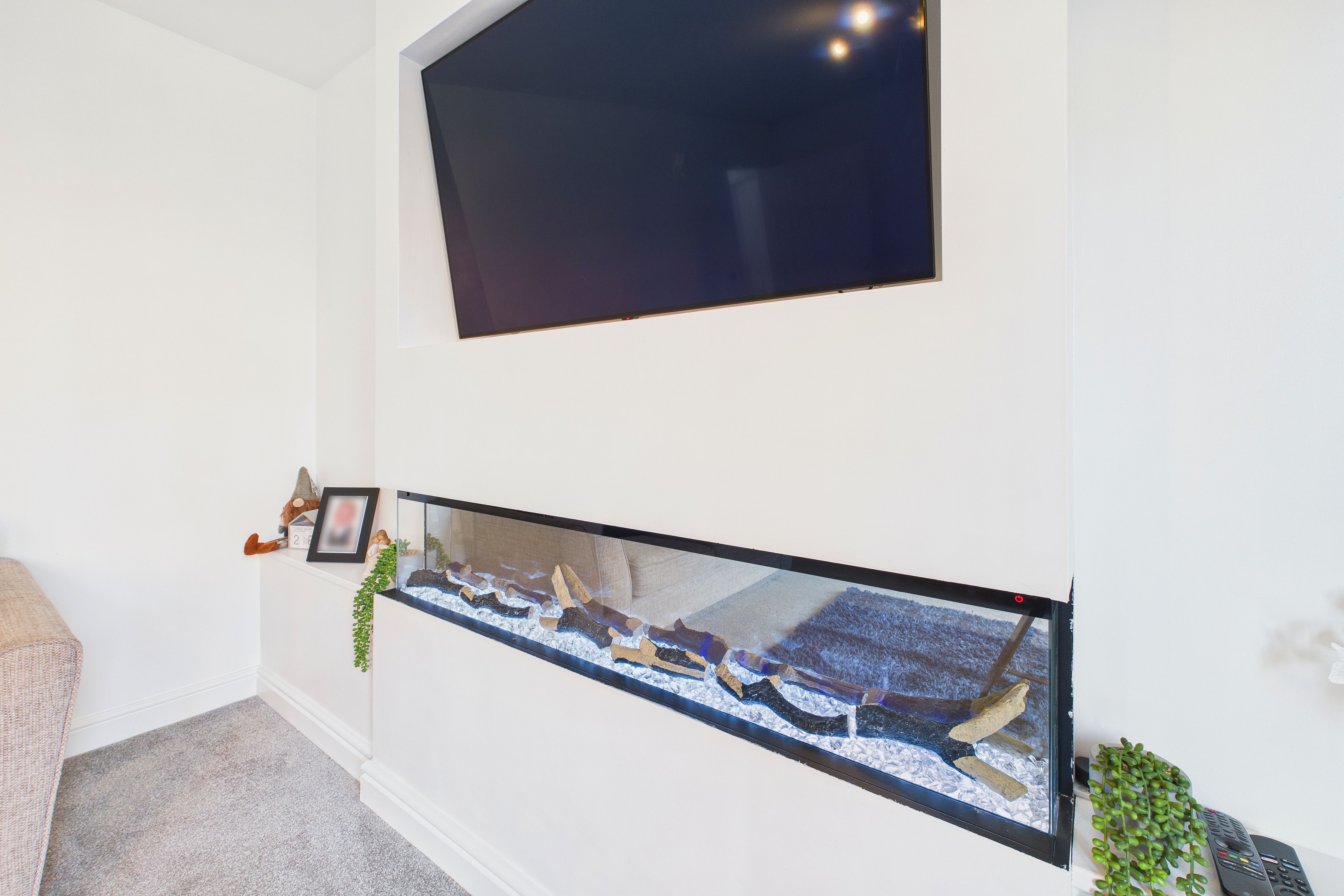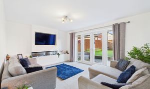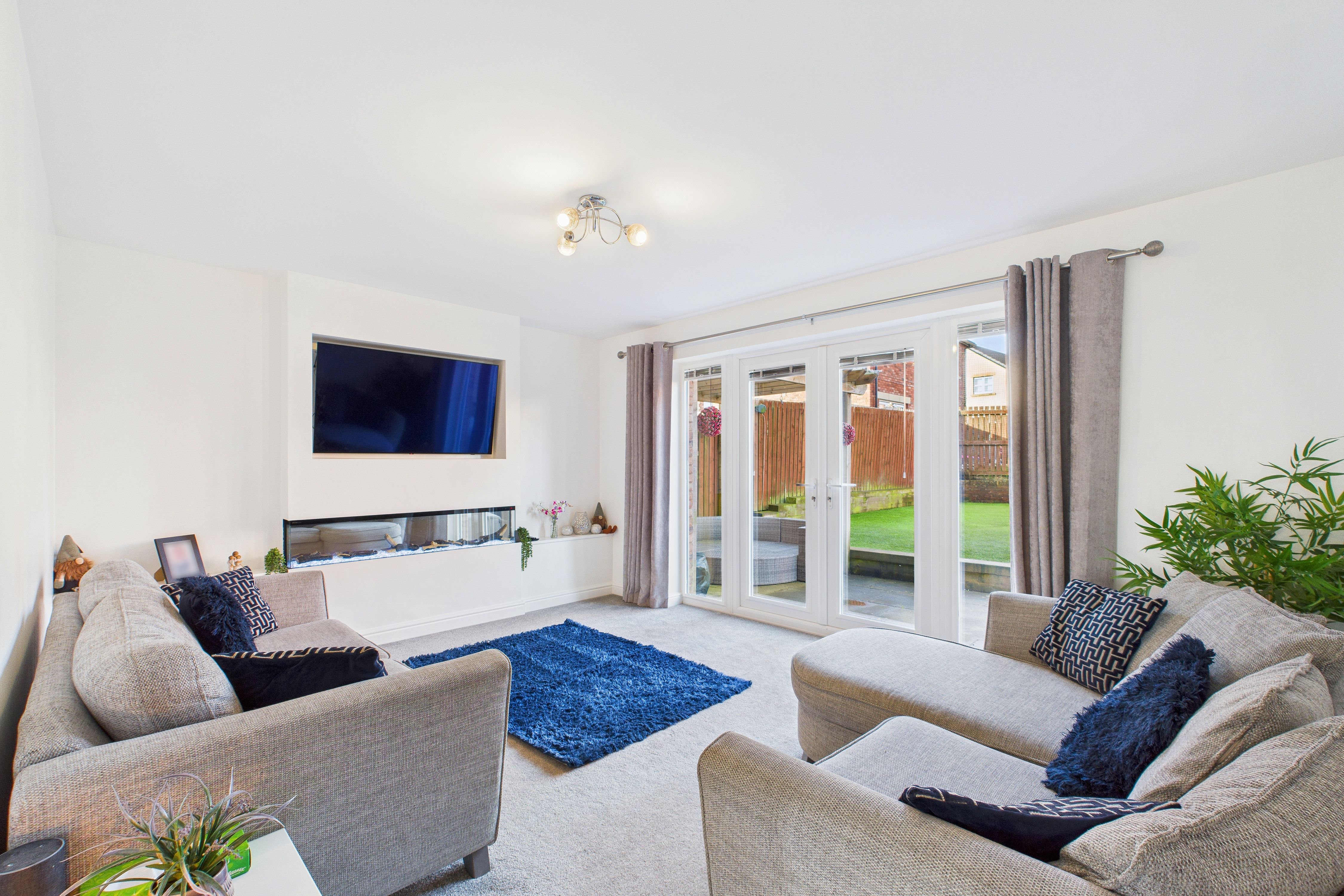 - Spacious lounge with stylish media wall with modern, integrated electric fire and French doors out to the rear