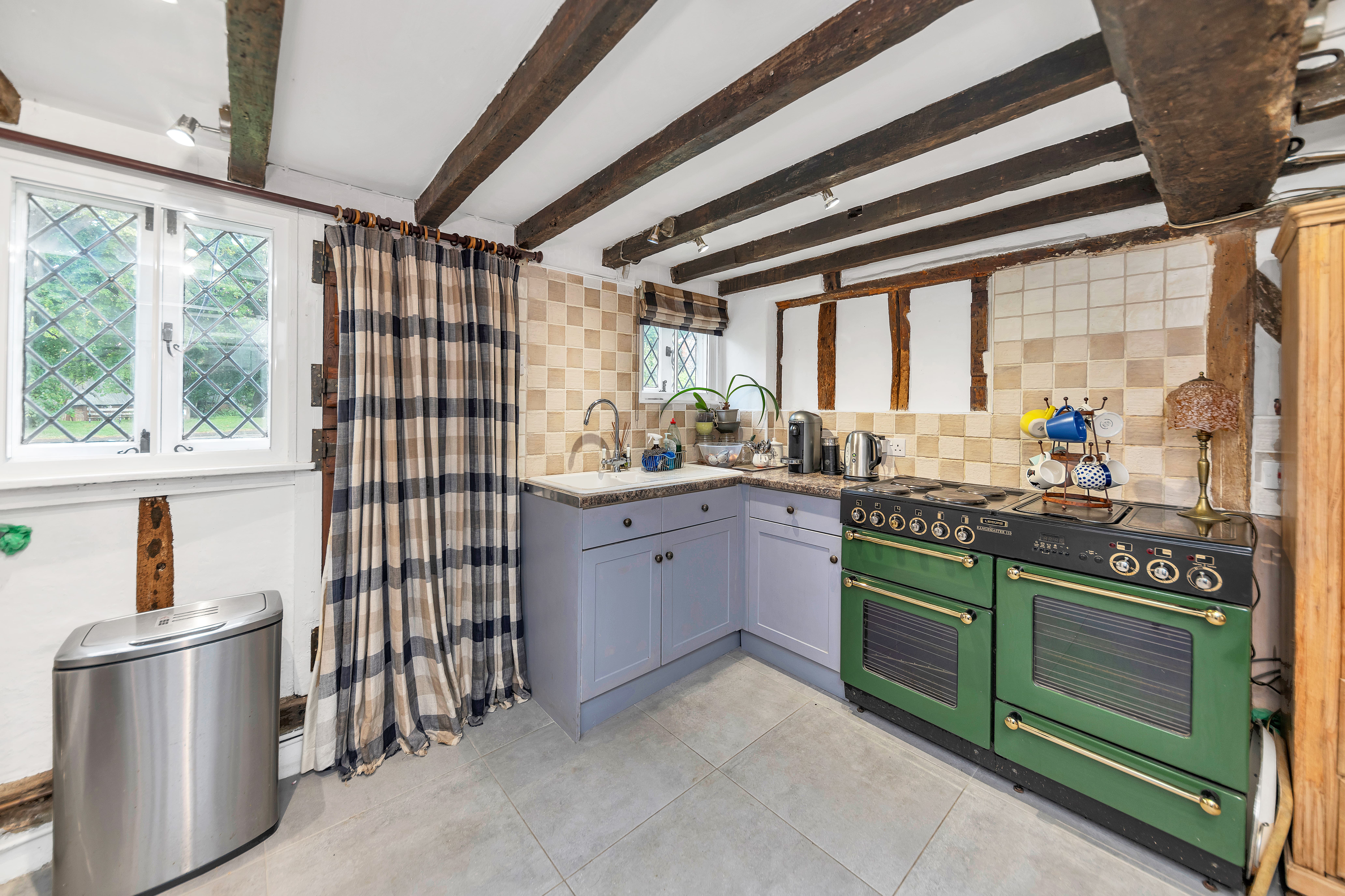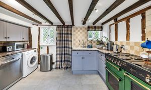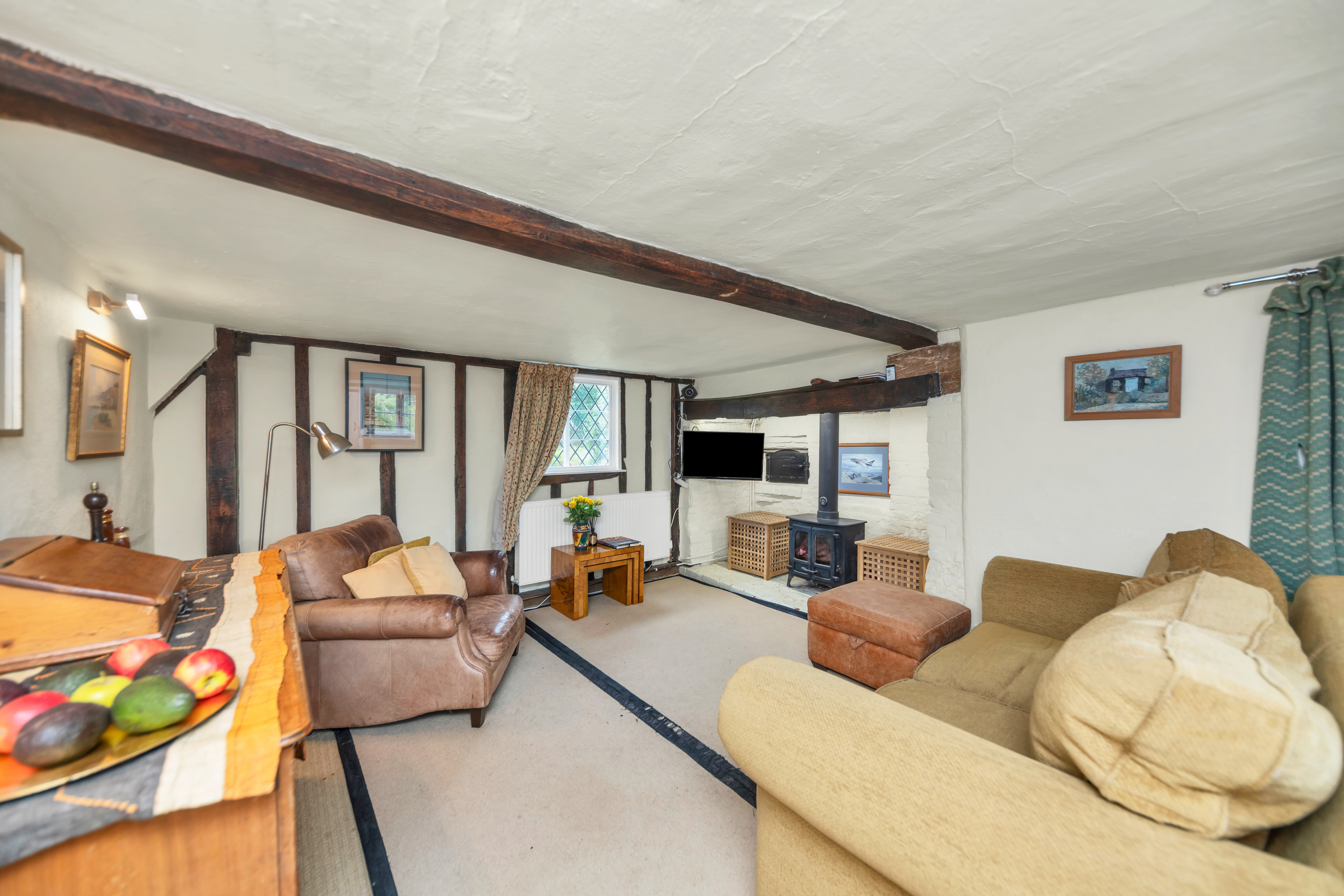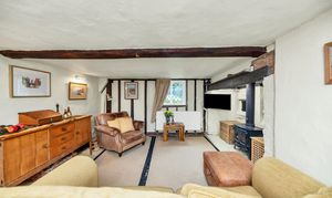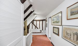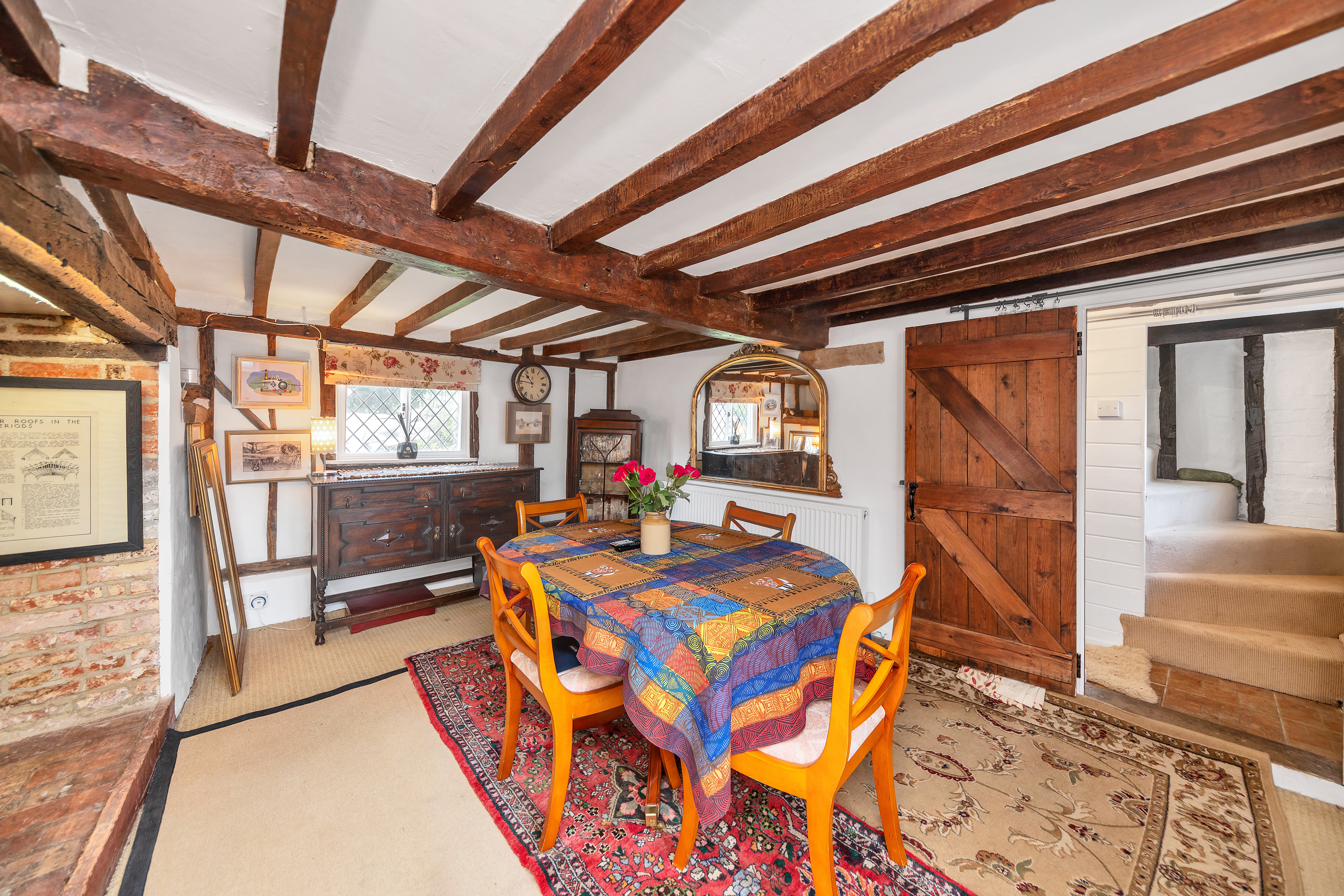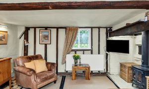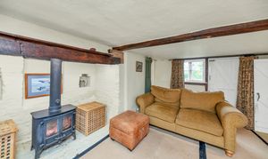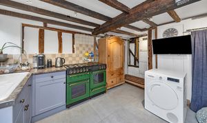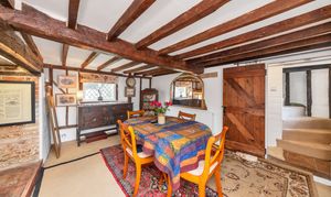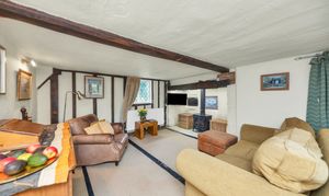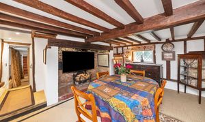 This unique and well-presented home enjoys excellent kerb appeal, fronting a green, with an attractive frontage packed full of character, front borders of well-tended flowers and plants, and space for pots. Upon stepping inside, the entrance hallway is wide and welcoming, with exposed beams and upstands, tiled flooring, sconce lighting, integrated storage, stairs to the first floor, and access through to the downstairs living space.