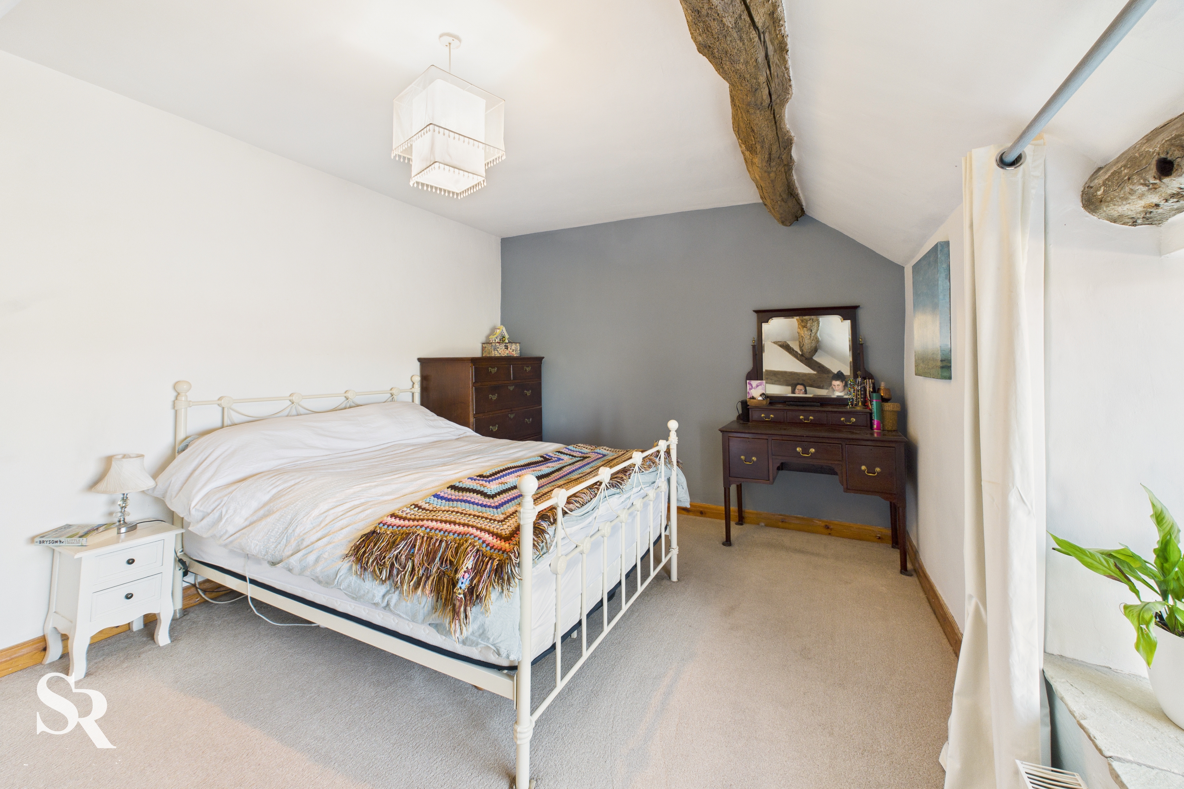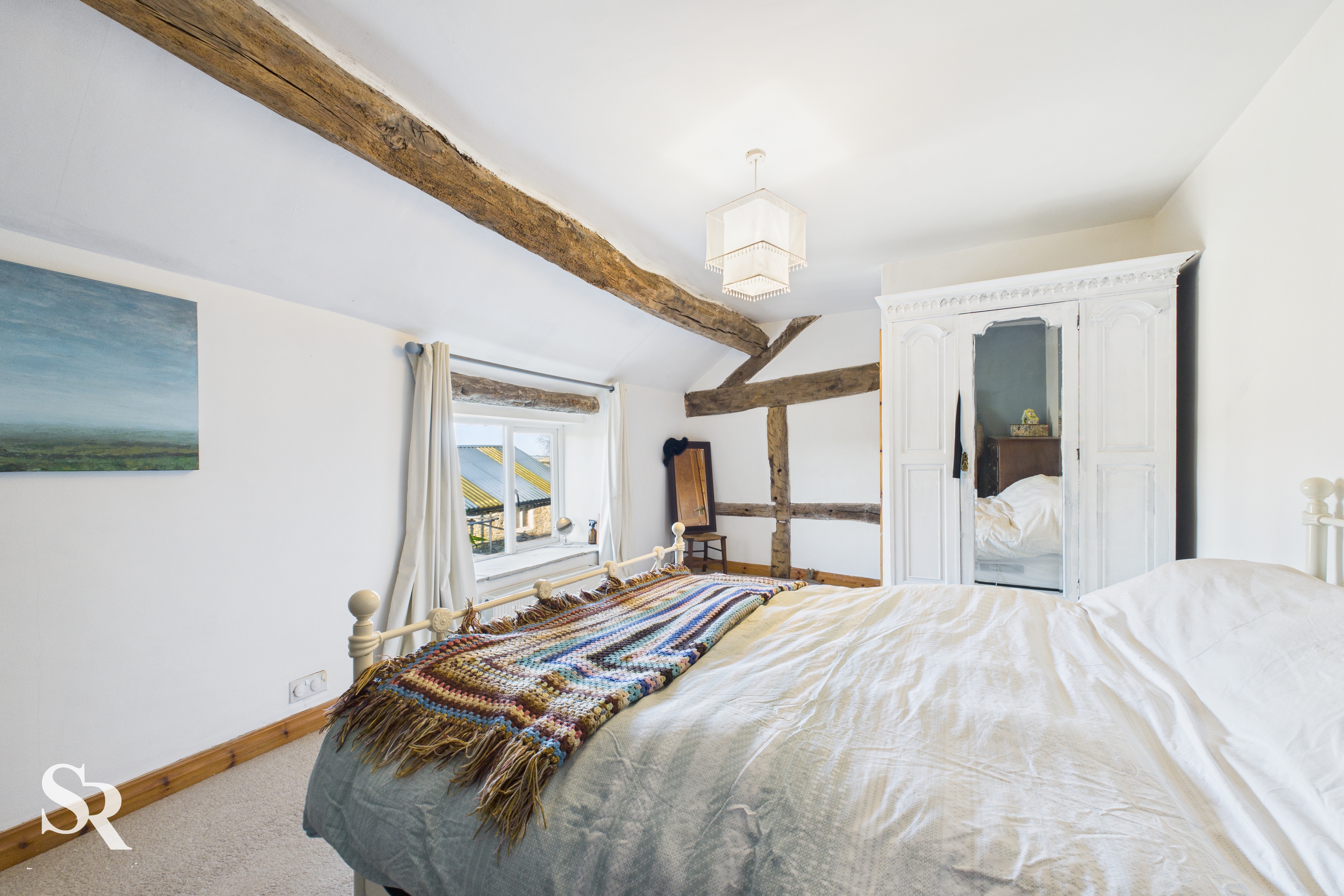 Double bedroom. Hardwood double glazed window with exposed oak beam and stone sill, to side elevation, exposed oak beams and exposed timber wall frames, radiator.
