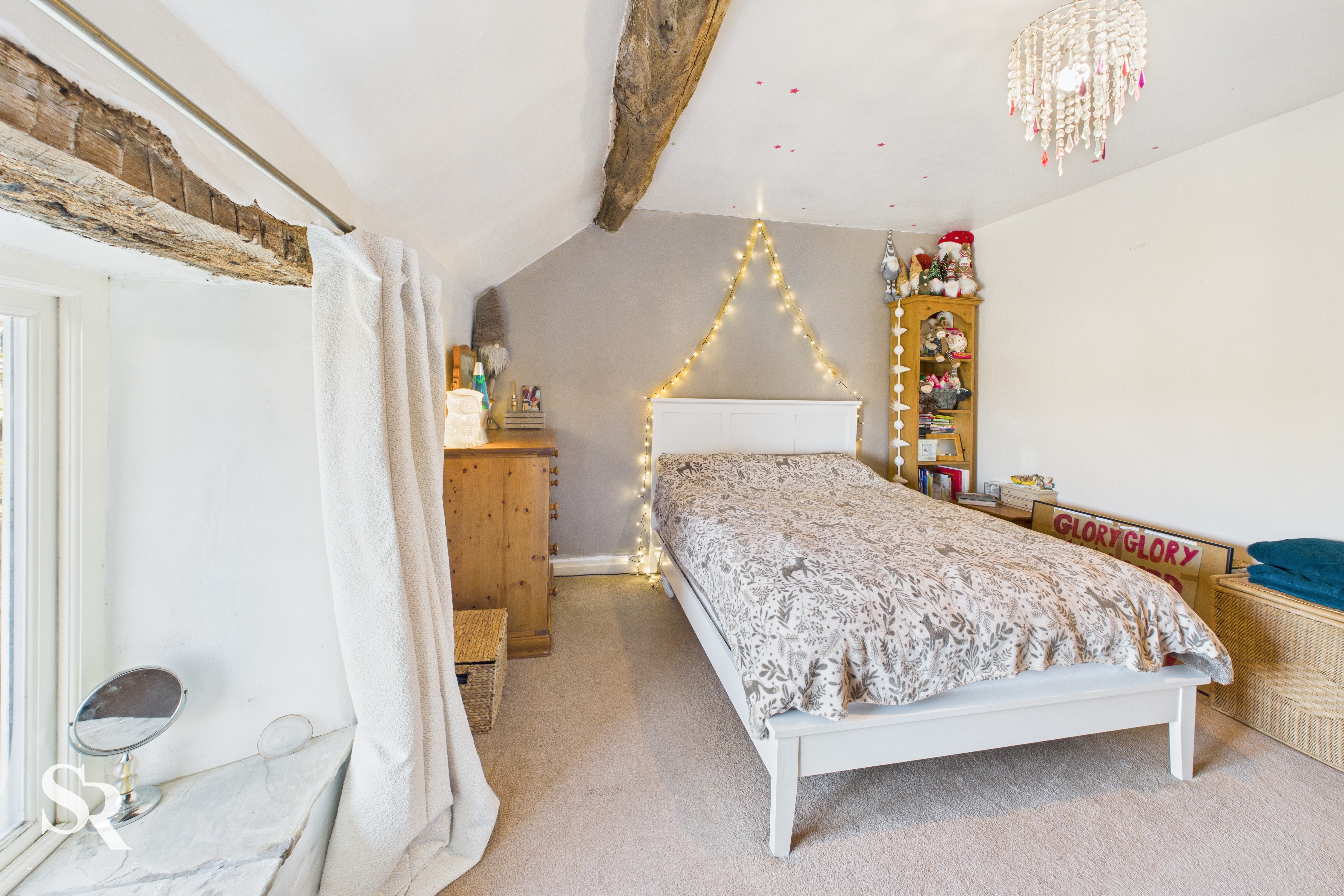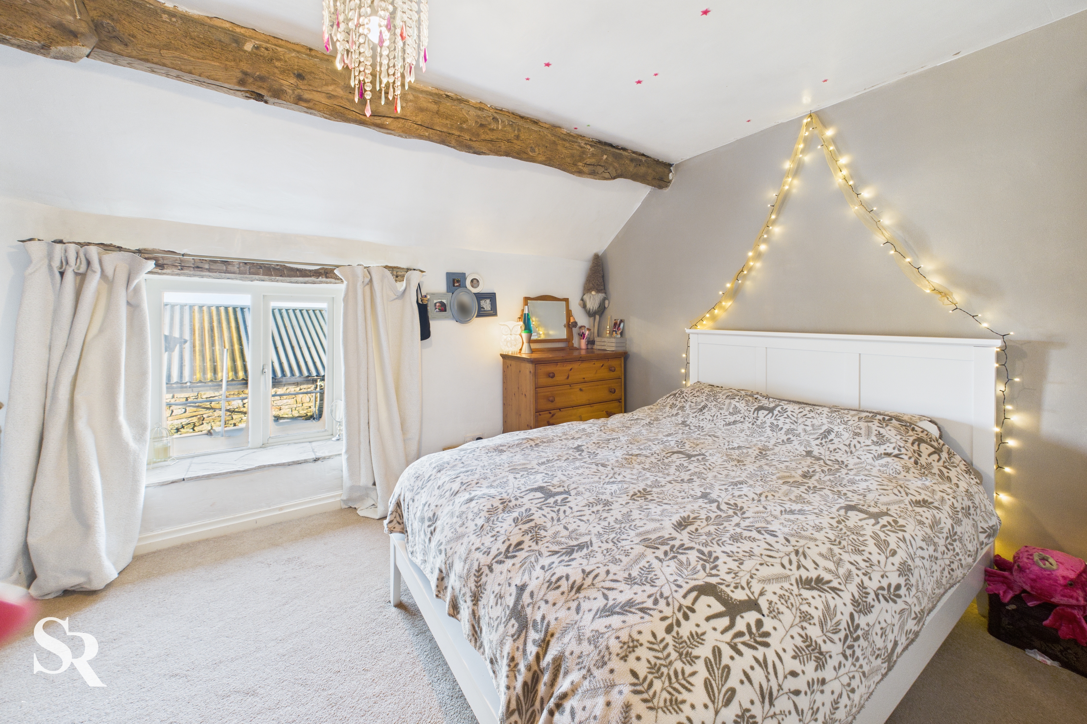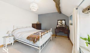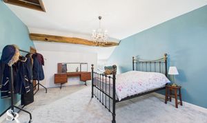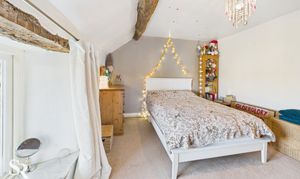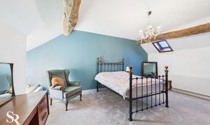 Hardwood double glazed window to side elevation, with exposed oak beam over and stone sill, exposed oak ceiling beams, exposed oak timber wall frames. Pine doors off to bedrooms two and three and family bathroom.