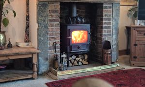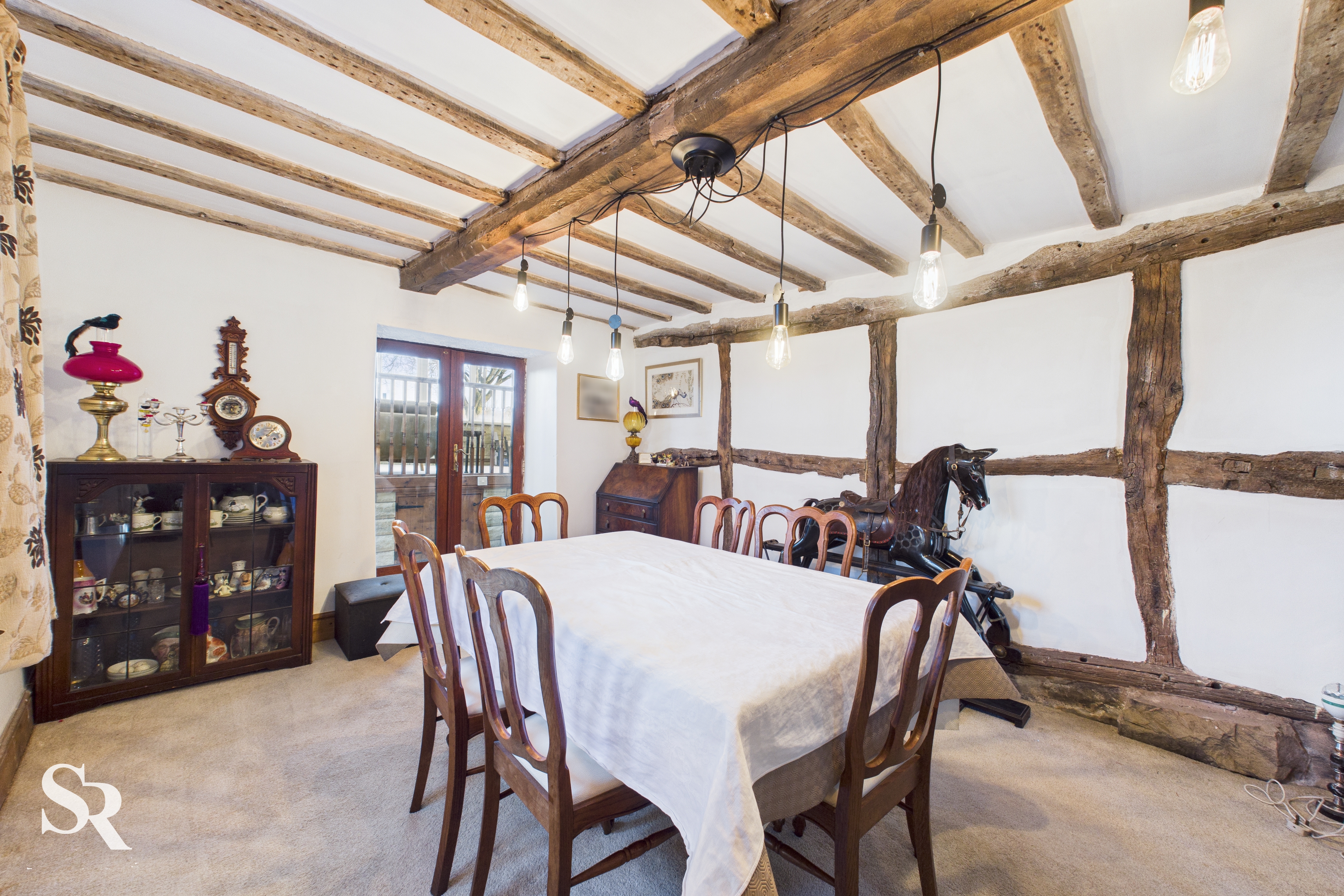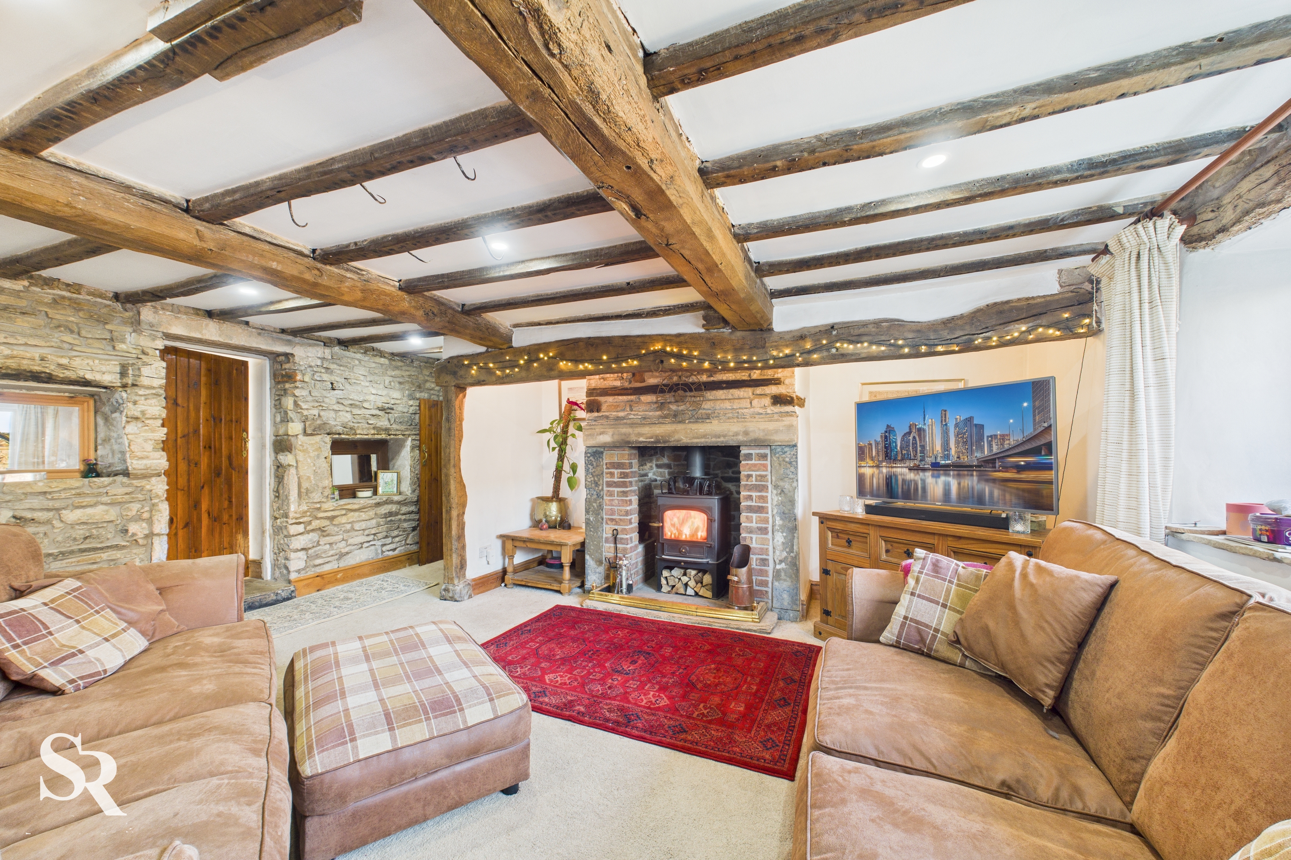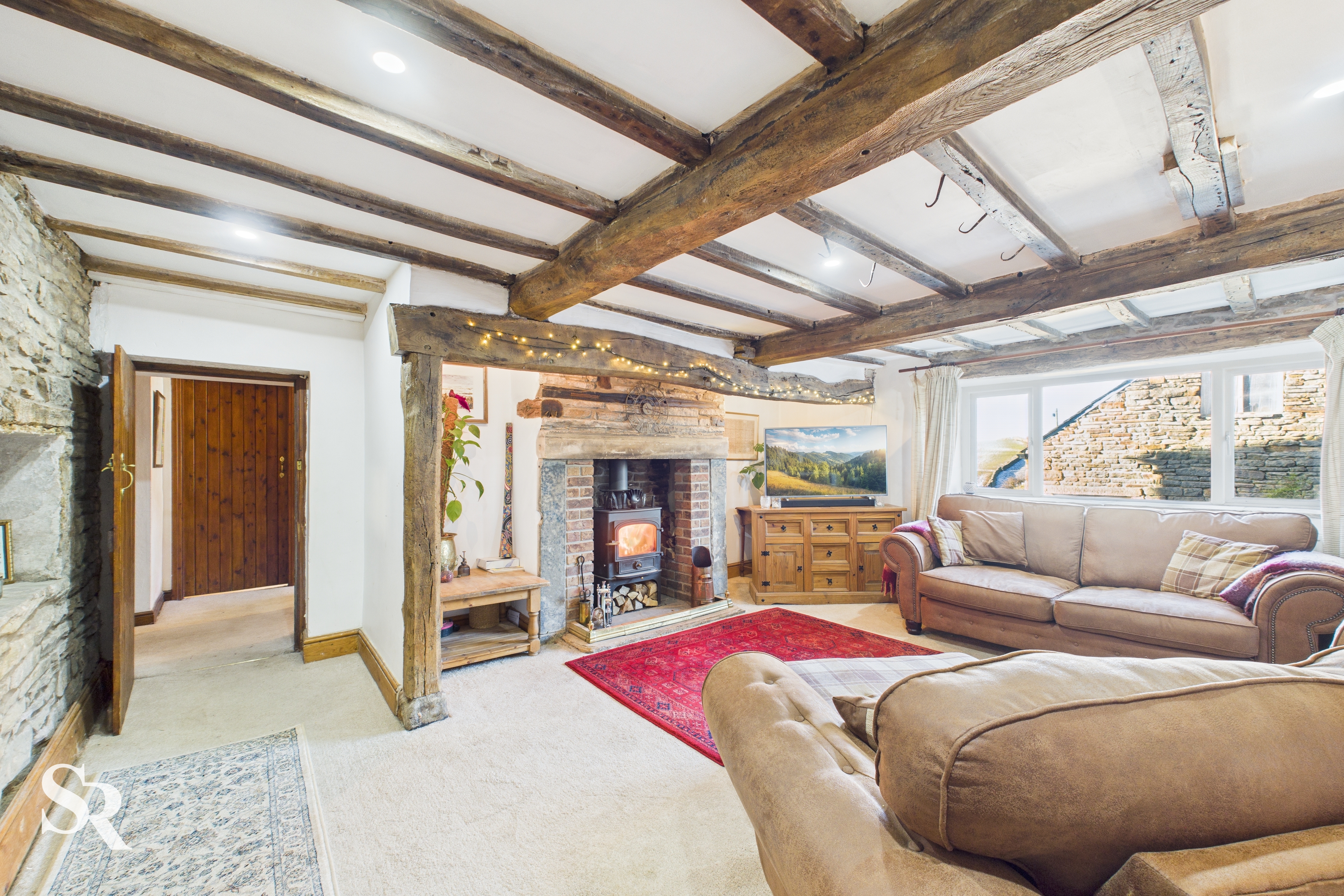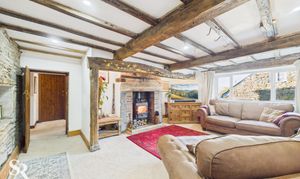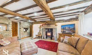 Hardwood double glazed windows to side elevations, exposed oak beams and oak timber frames, original feature hooks in ceiling beams, feature brick and stone fireplace with stone lintels, alcoves with downlights, feature stone wall with inset shelving (original windows), exposed beamed arch leading to dining room.