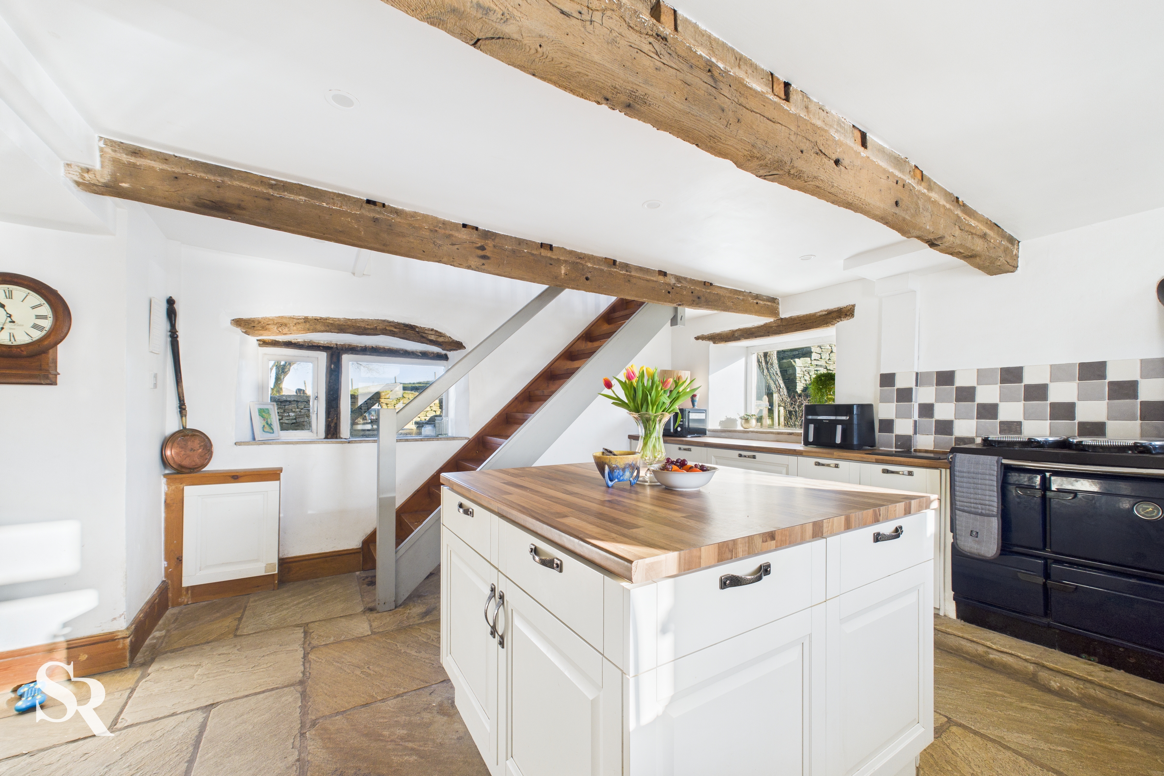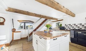 Hardwood double glazed windows with stone sills and exposed oak beams over. Windows looking onto front, side and rear elevations. Cream shaker base units with ample storage, middle island with drawers and cupboards, space for washing machine and dishwasher. Aga, induction hob, ceramic sink with brass mixer tap over, wooden style work tops, exposed oak beams, down lights, stone tiled floor.