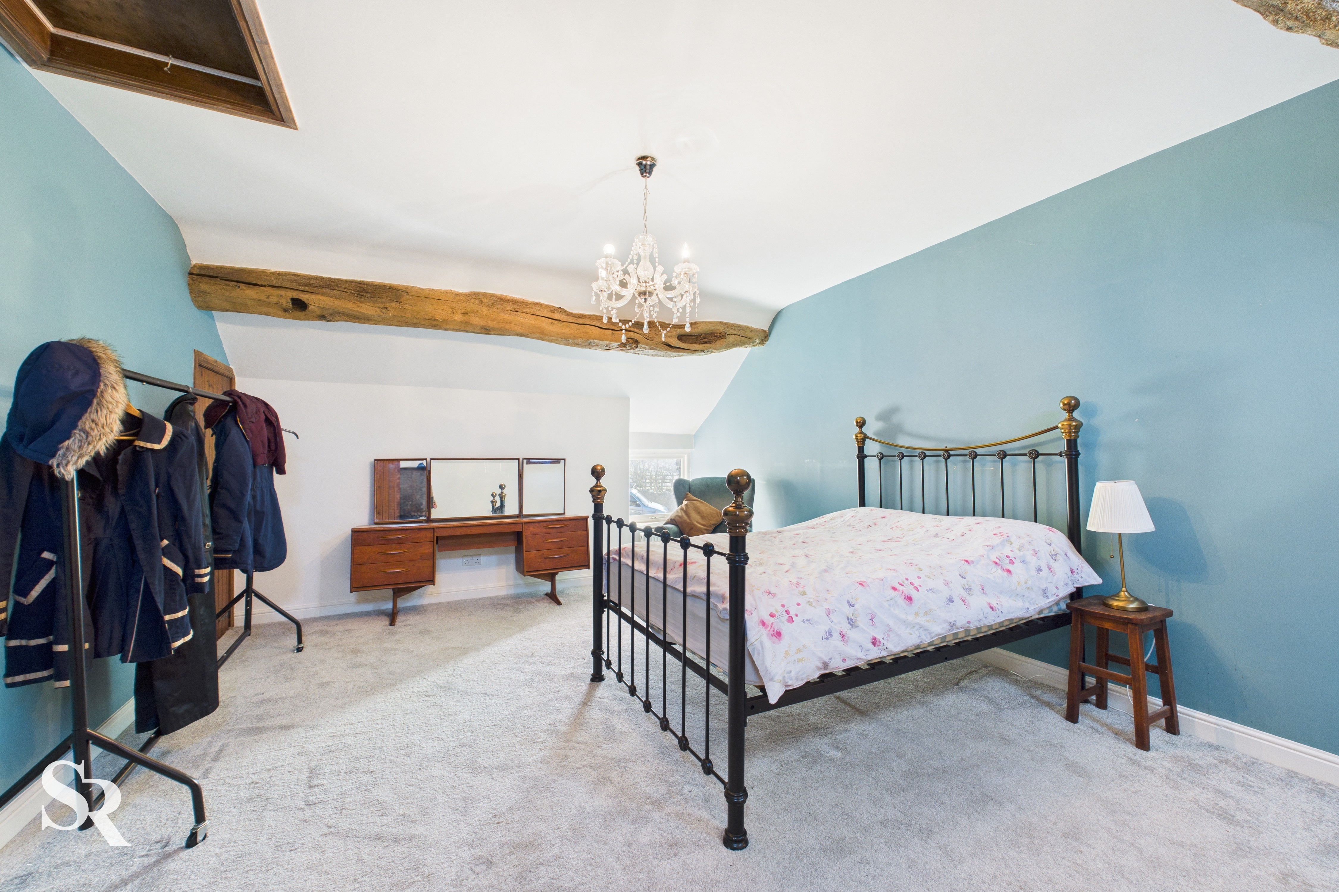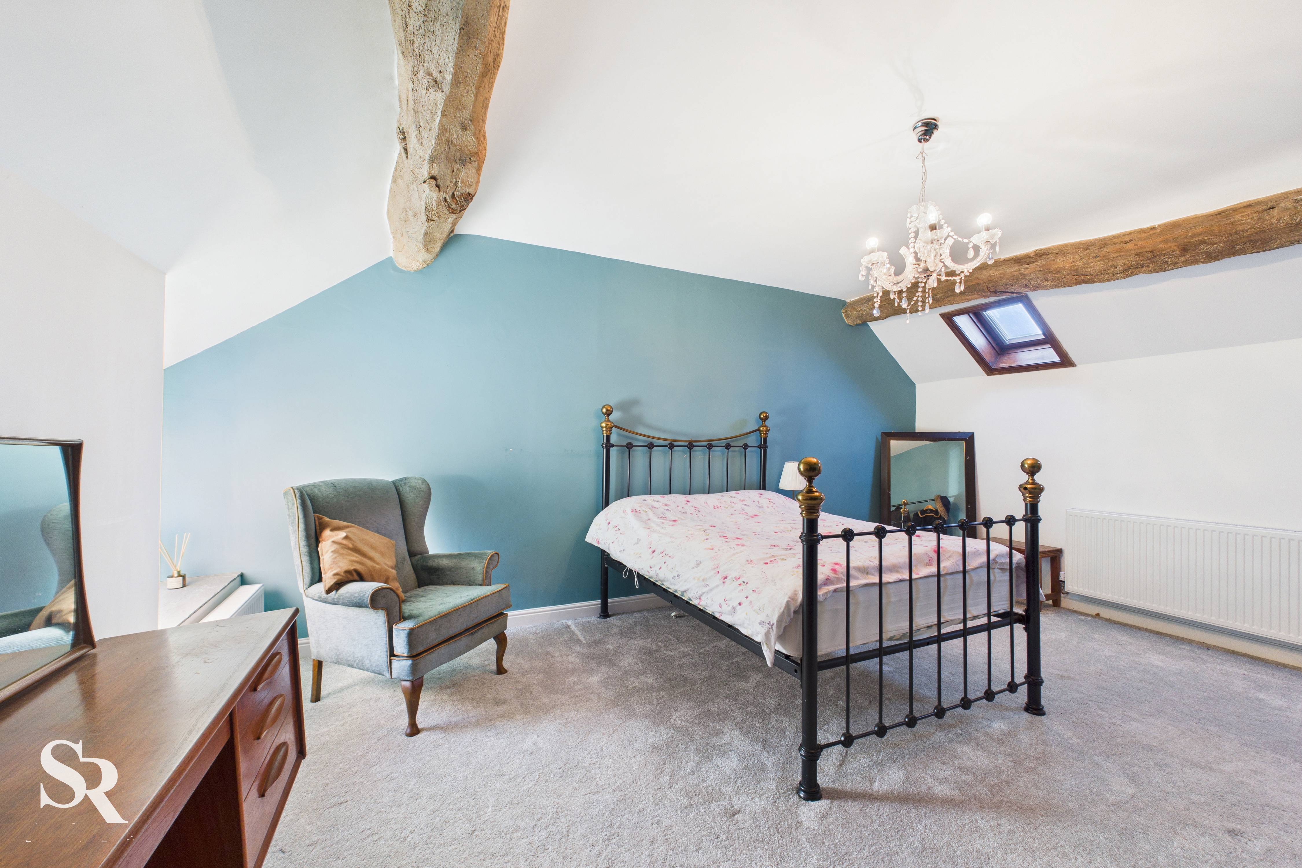 Hardwood double glazed window to side elevation, exposed oak beams, loft access, two Velux windows, radiator.