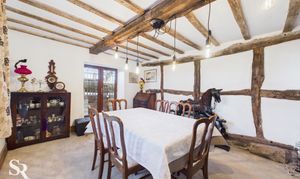 Vaulted dining area with space for American fridge/freezer, leaded window looking into front porch, exposed oak beams, high window to rear elevation, radiator' stone flooring. Open plan staircase leading to snug room.