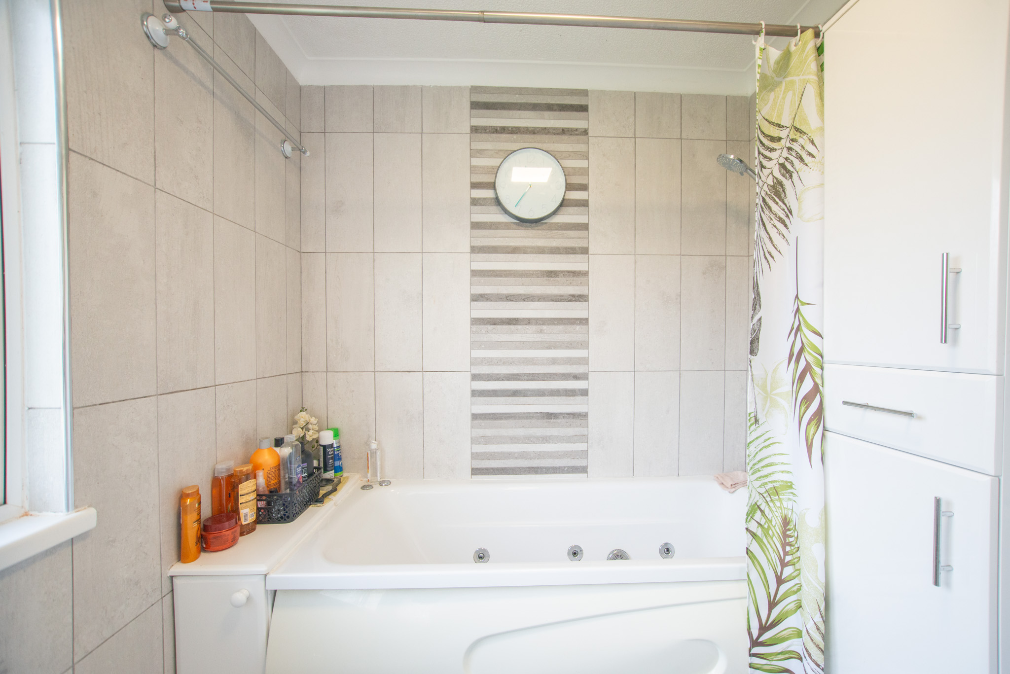 With laminate flooring, tiled wall, bath with shower attachment, wash basin with vanity unit, toilet, and radiator.