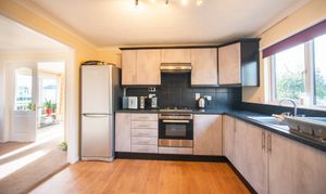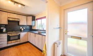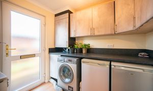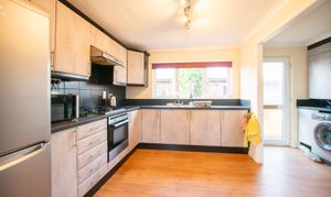 With laminate flooring, kitchen units, laminate worktop, plumbing for washing machine, boiler, and door to the rear.