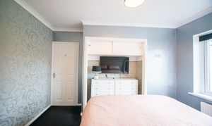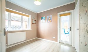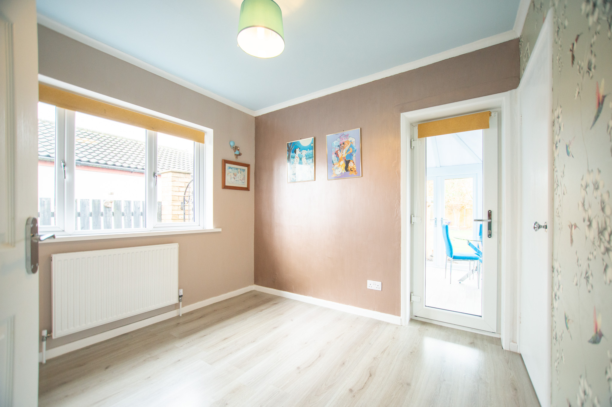 With laminate flooring, built in wardrobe, door leading in to the conservatory, power points, radiator, and large window.