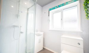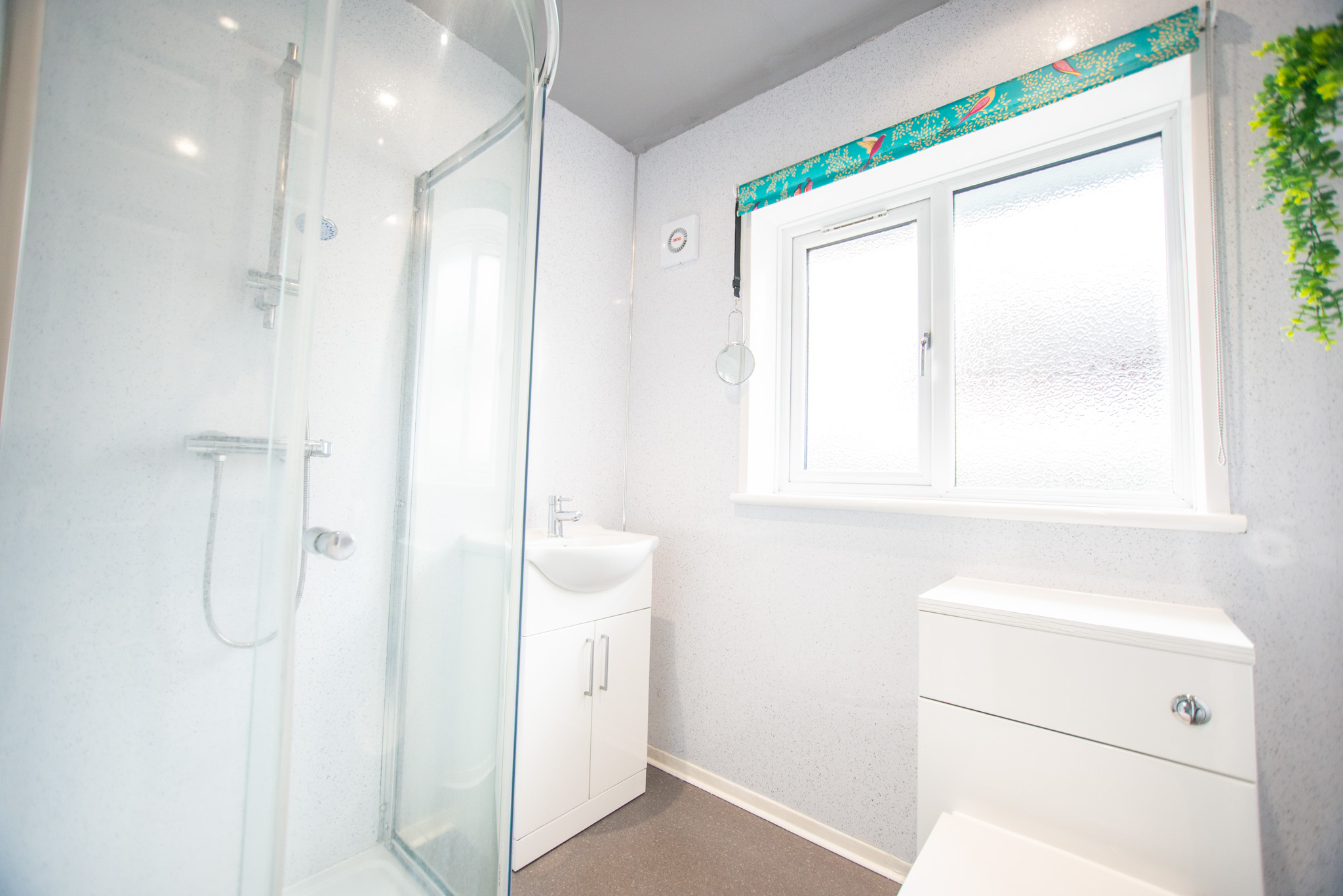 With vinyl flooring, shower cubicle, wash basin with vanity unit, W/C, heated towel rail, extractor fan, and large window.