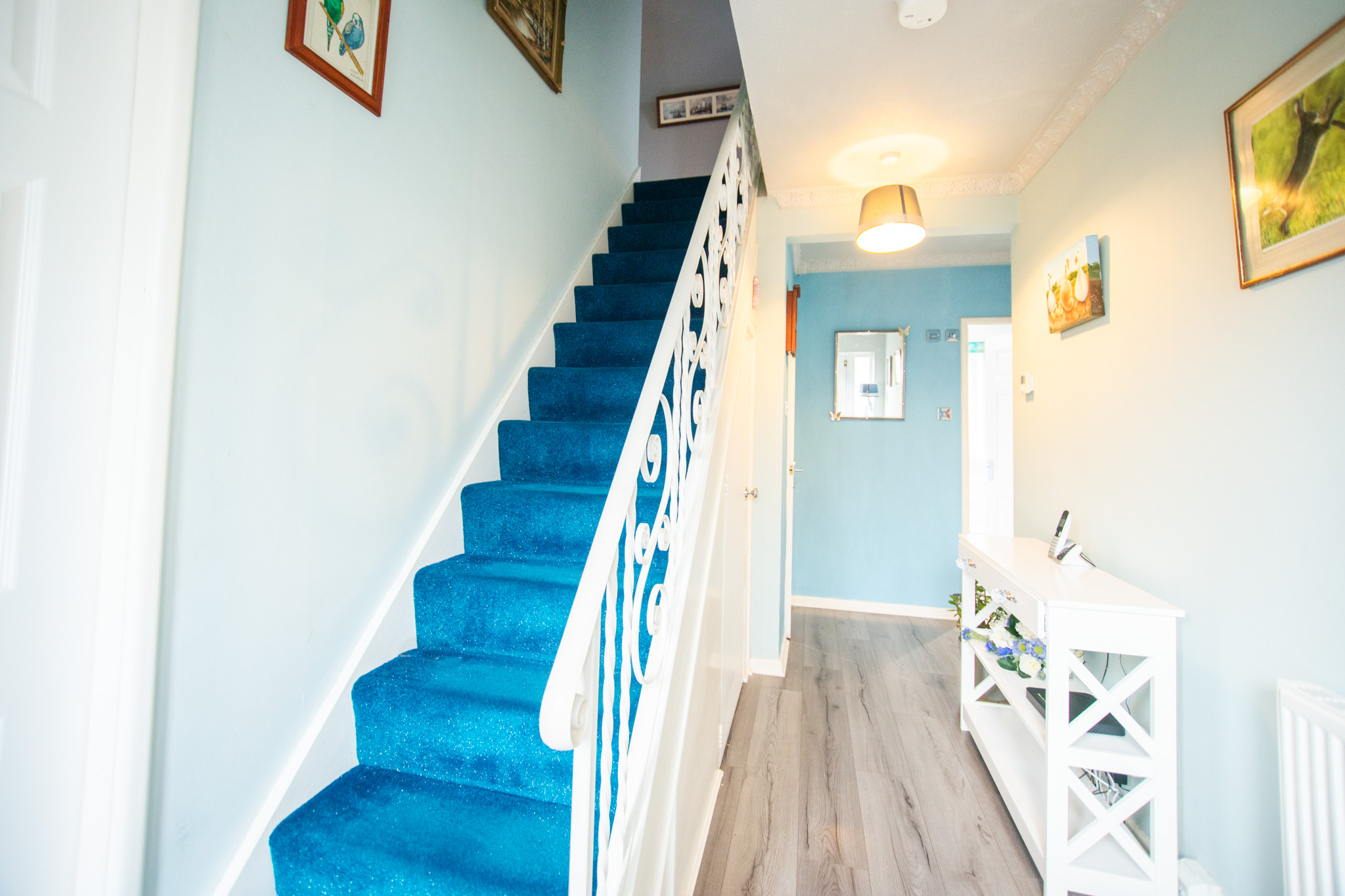 With laminate flooring, power points, telephone socket, radiator, door to the front of the property, and stairs to second floor.