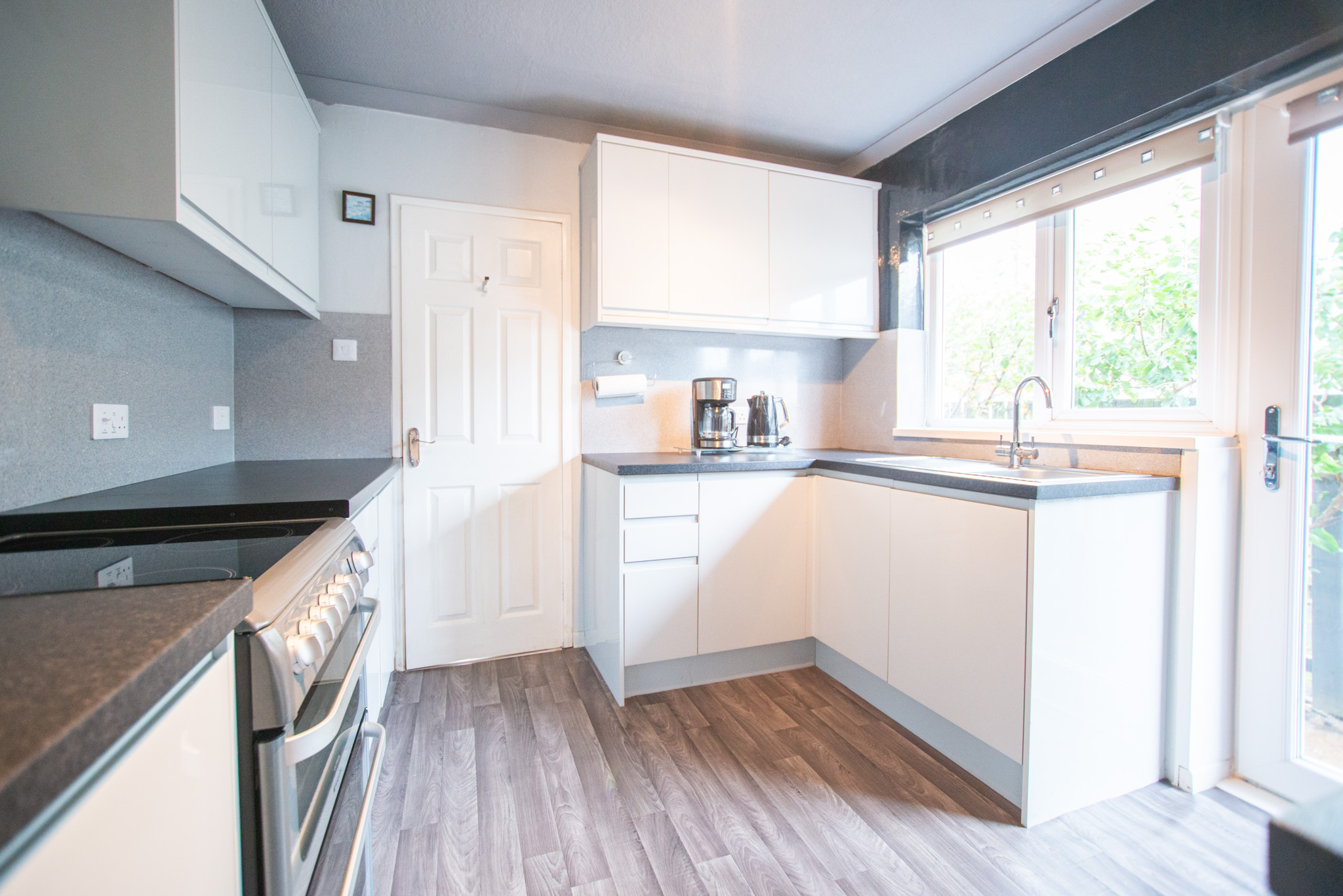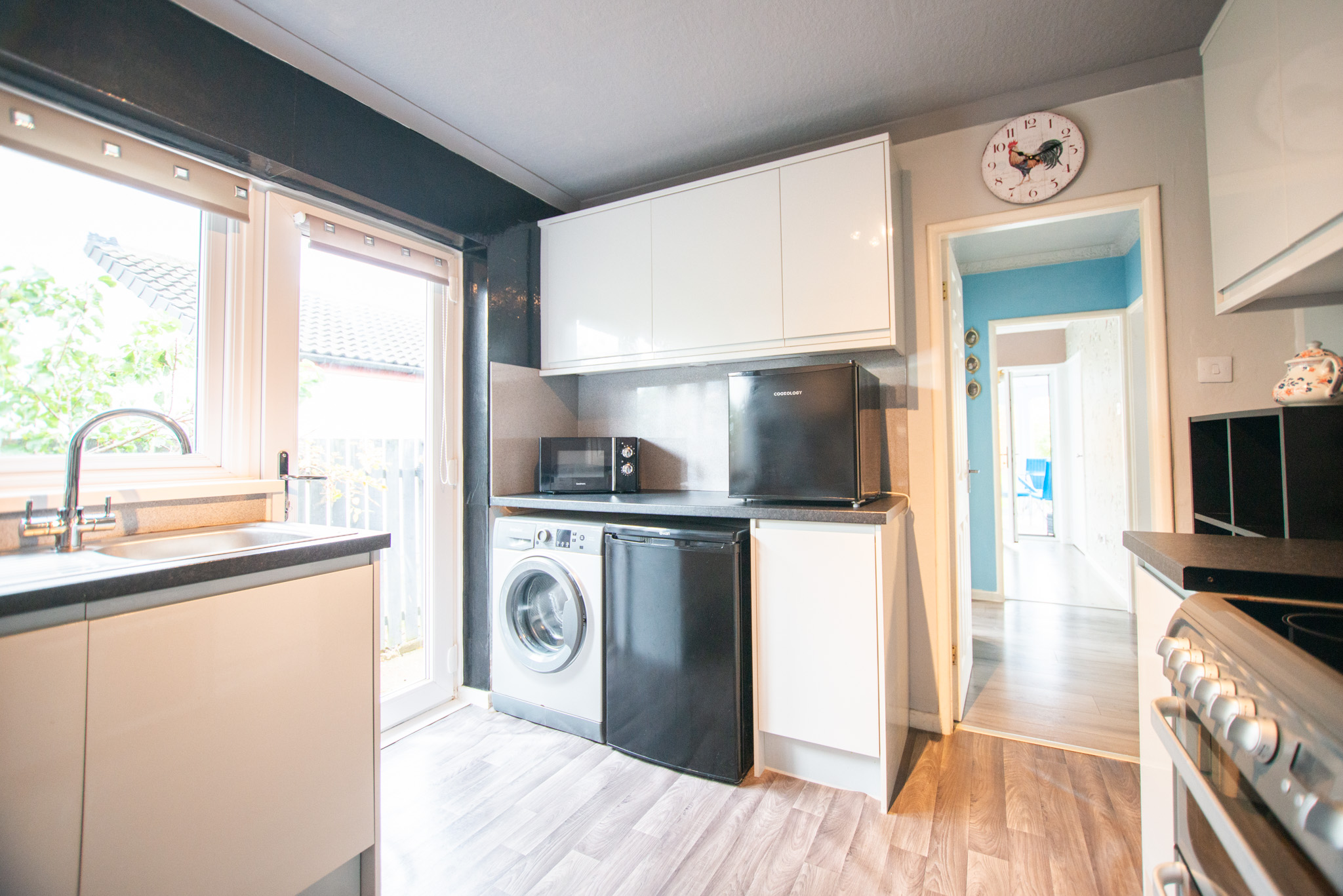 With vinyl flooring, dove grey handleless kitchen units, laminate worktops, sink and tap, free standing oven and hob, plumbing for washing machine, power points, and door to the side walk way.