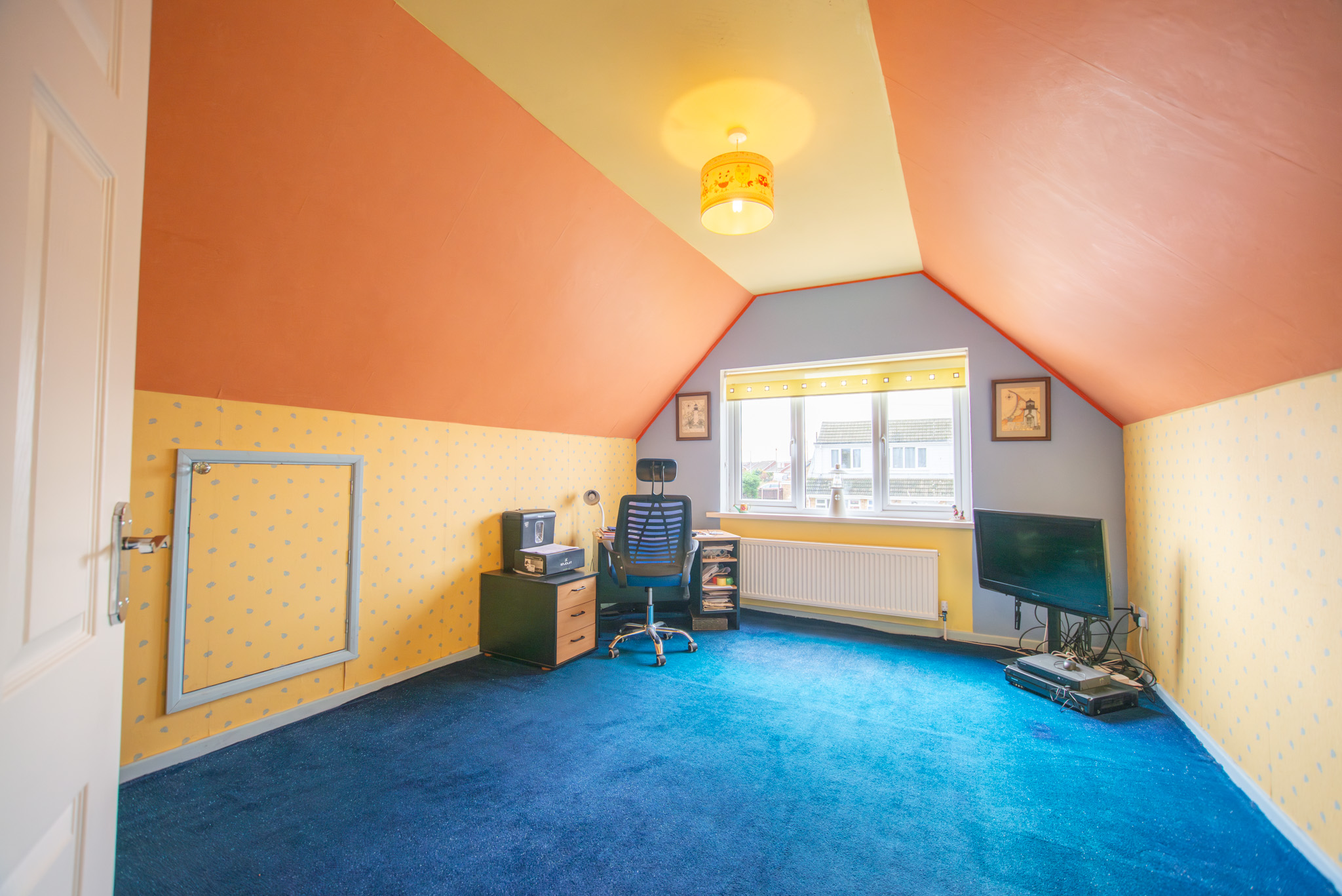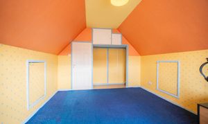 With carpet, eaves storage on both sides of the room with lighting, power point, aerial point, high level storage cupboards, radiator, and large window.