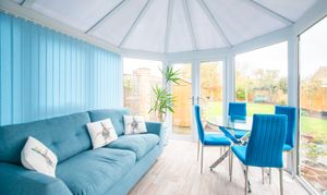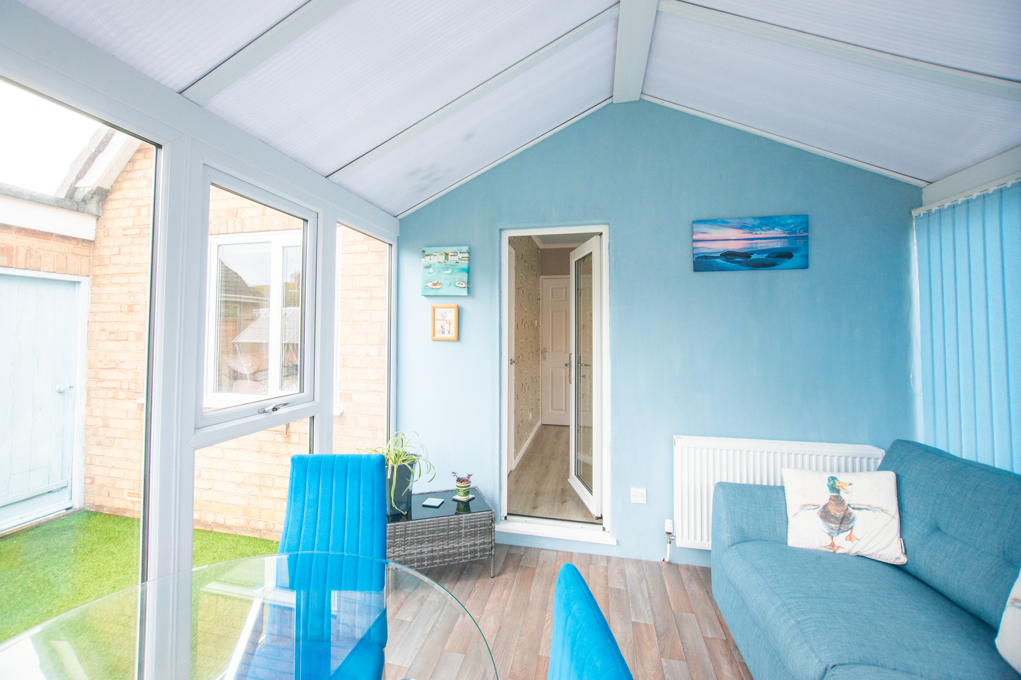 With vinyl floor, French doors into the garden, floor to ceiling glass panelled side, poly-carbonate roof, internal door into the property, power points, aerial point, and radiator.