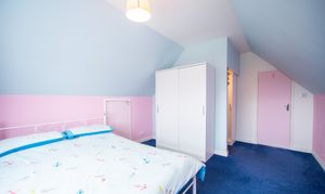 With carpet, walk in wardrobe with lighting, access to eaves storage of room with lighting, power points, aerial point, radiator, and large window.