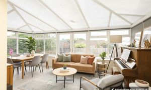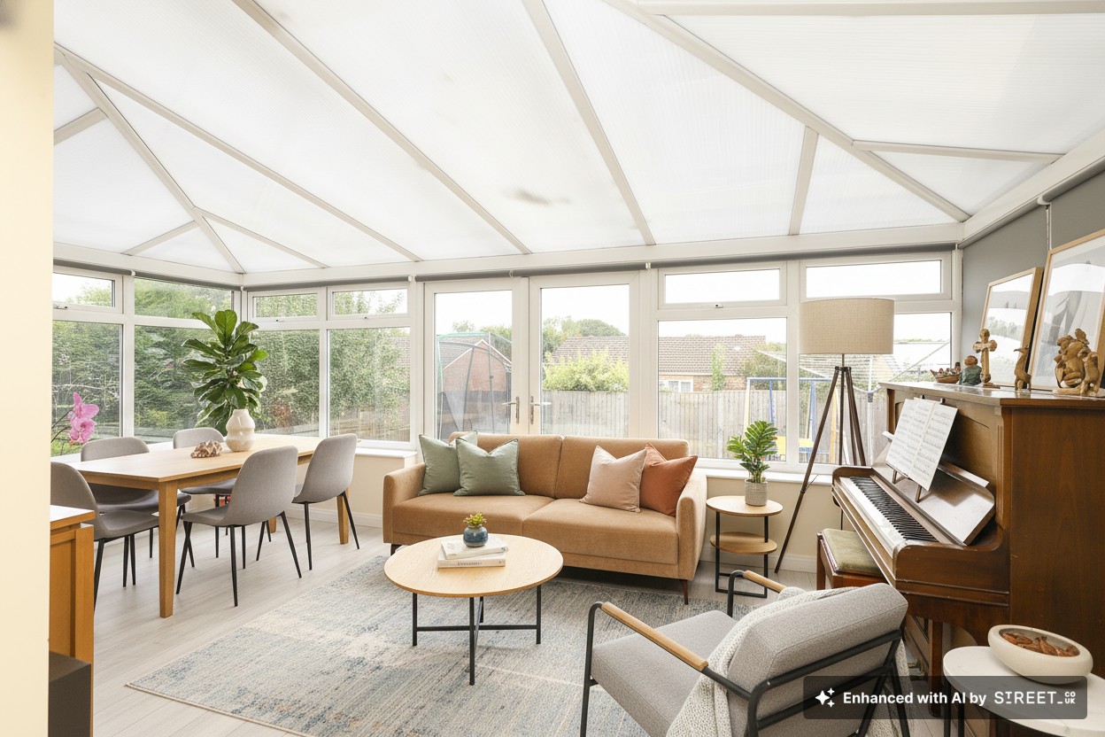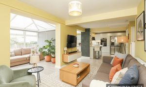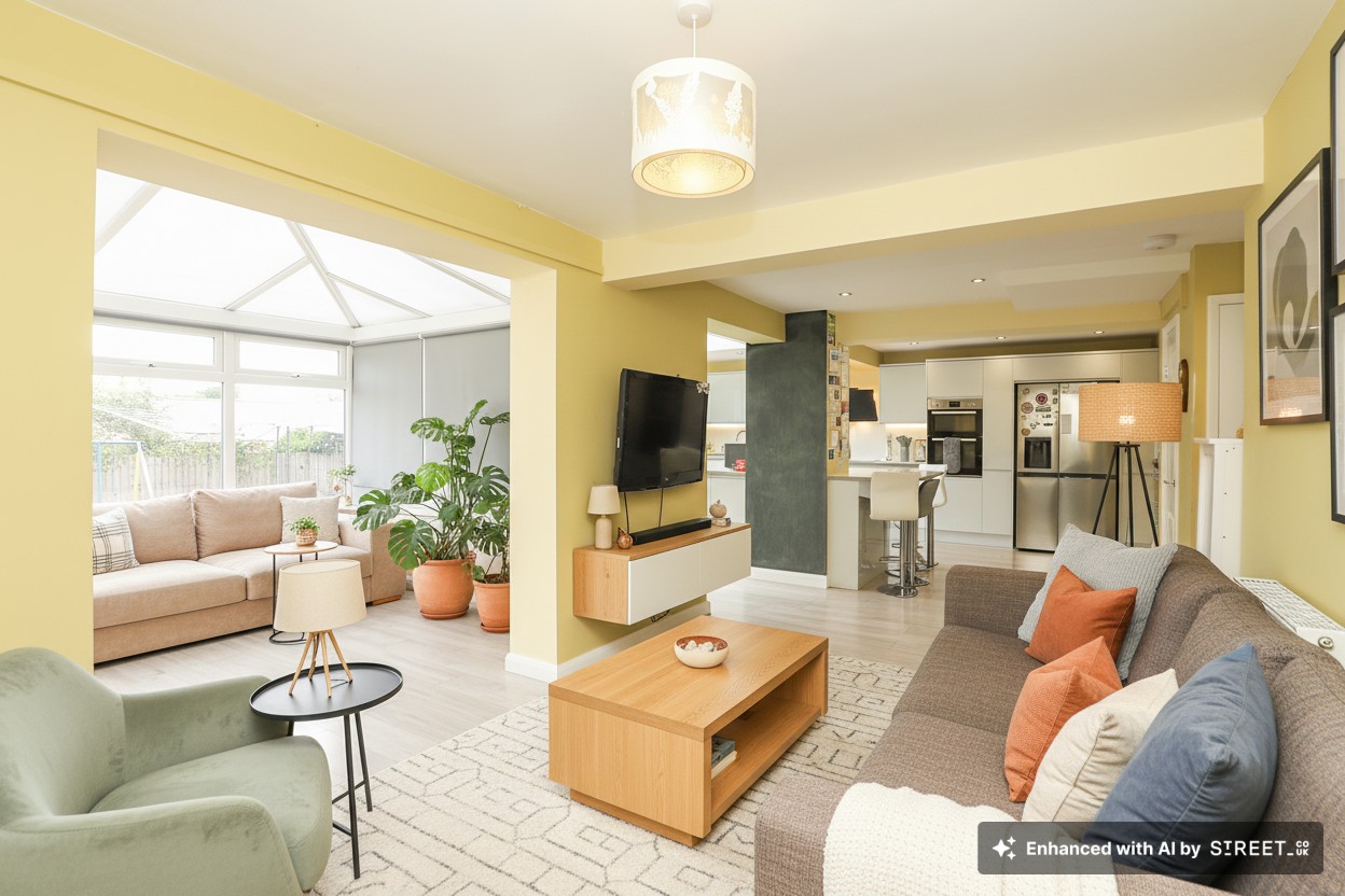 The modern layout is suited for contemporary living, the home boasts comfort and style at every turn. The generously sized breakfast kitchen is bathed in natural light streaming through a lantern skylight and French doors, forming a seamless connection with the outdoors. Complete with a full range of integrated appliances and a striking breakfast island, the kitchen effortlessly transitions into the open plan dining area, which flows into the expansive garden room overlooking the rear garden. Additionally, the home features a separate living room, providing an inviting space for families to unwind. A utility room and ground floor w/c add practicality to every-day living.