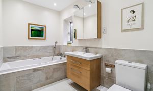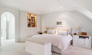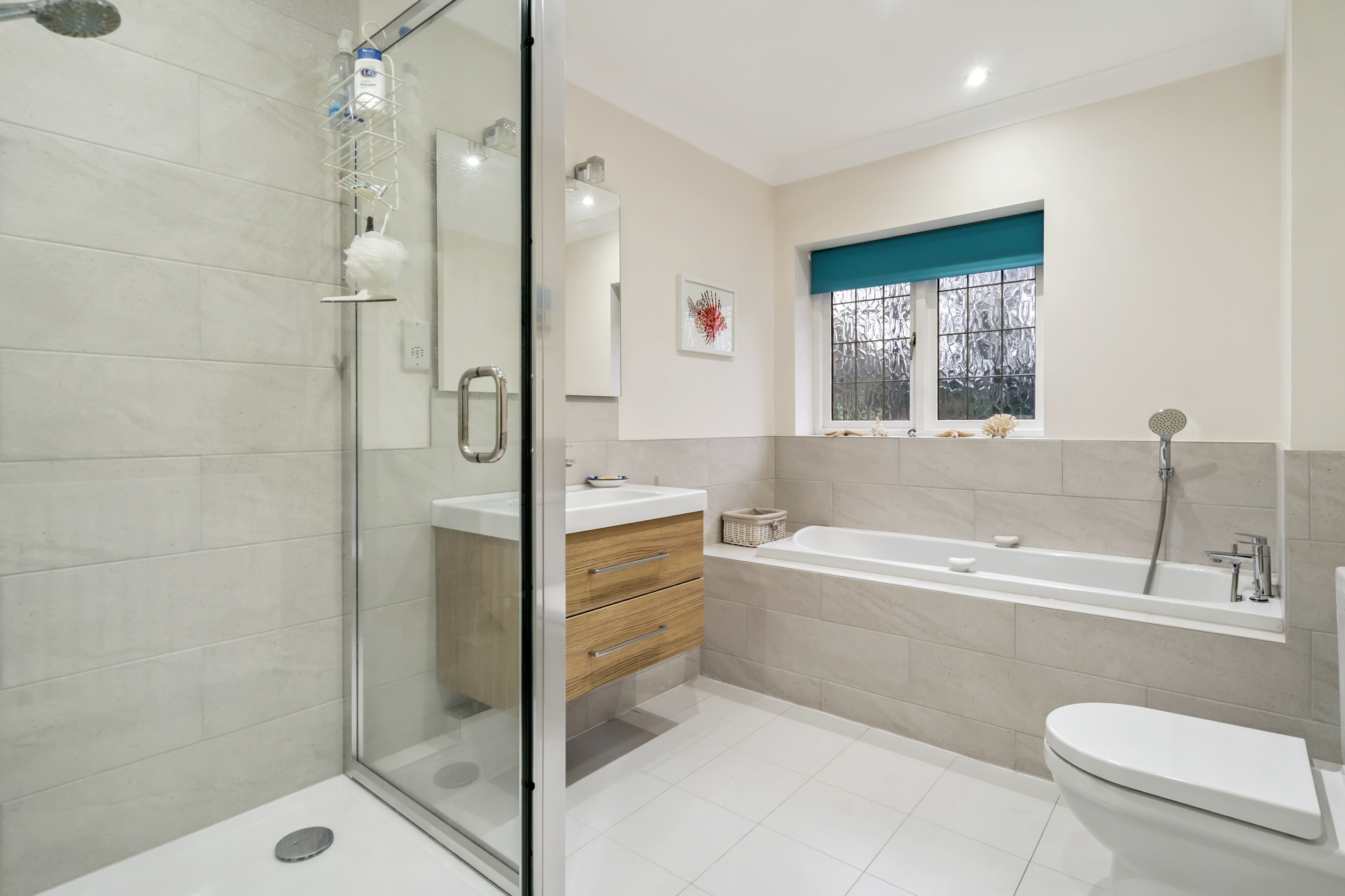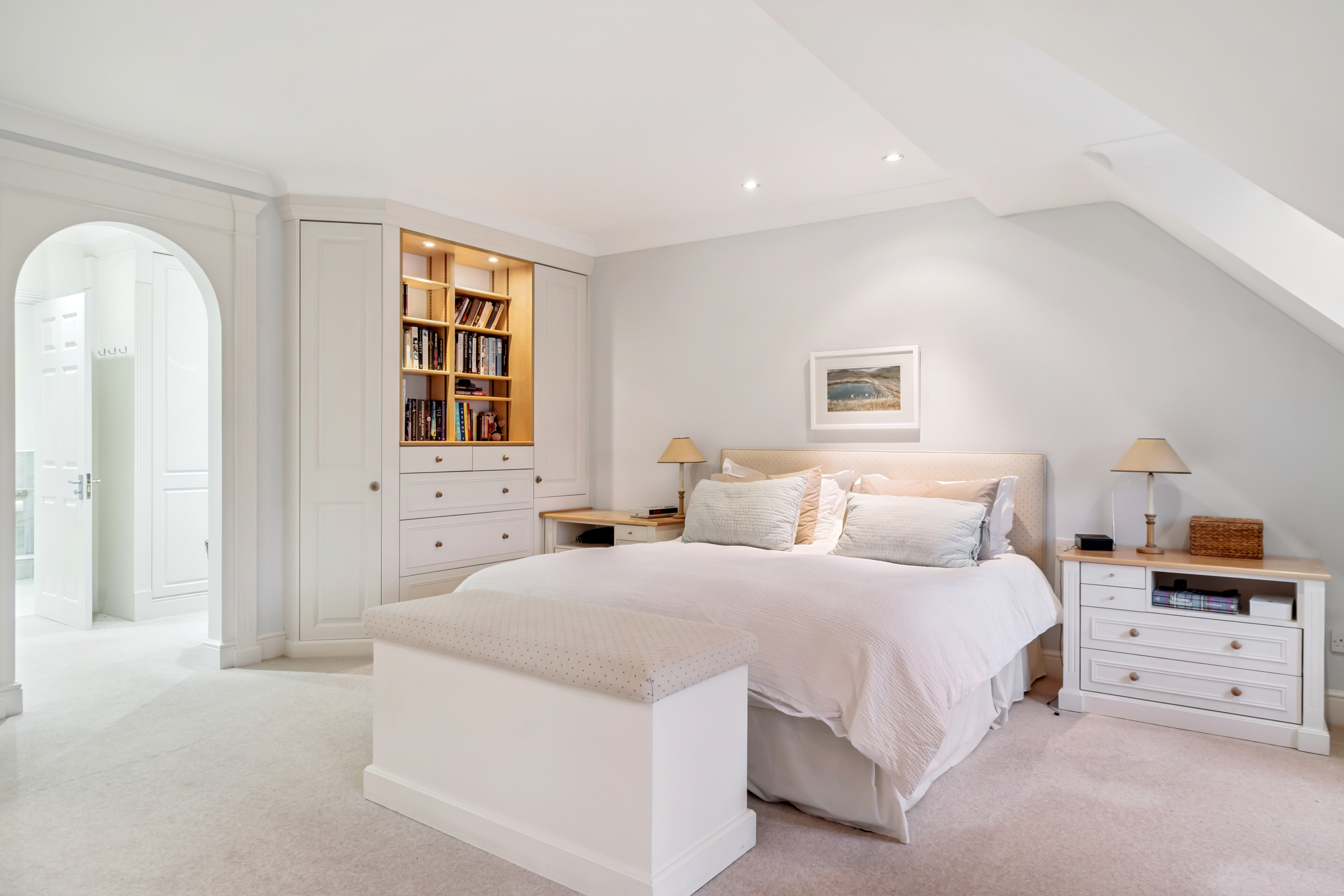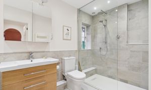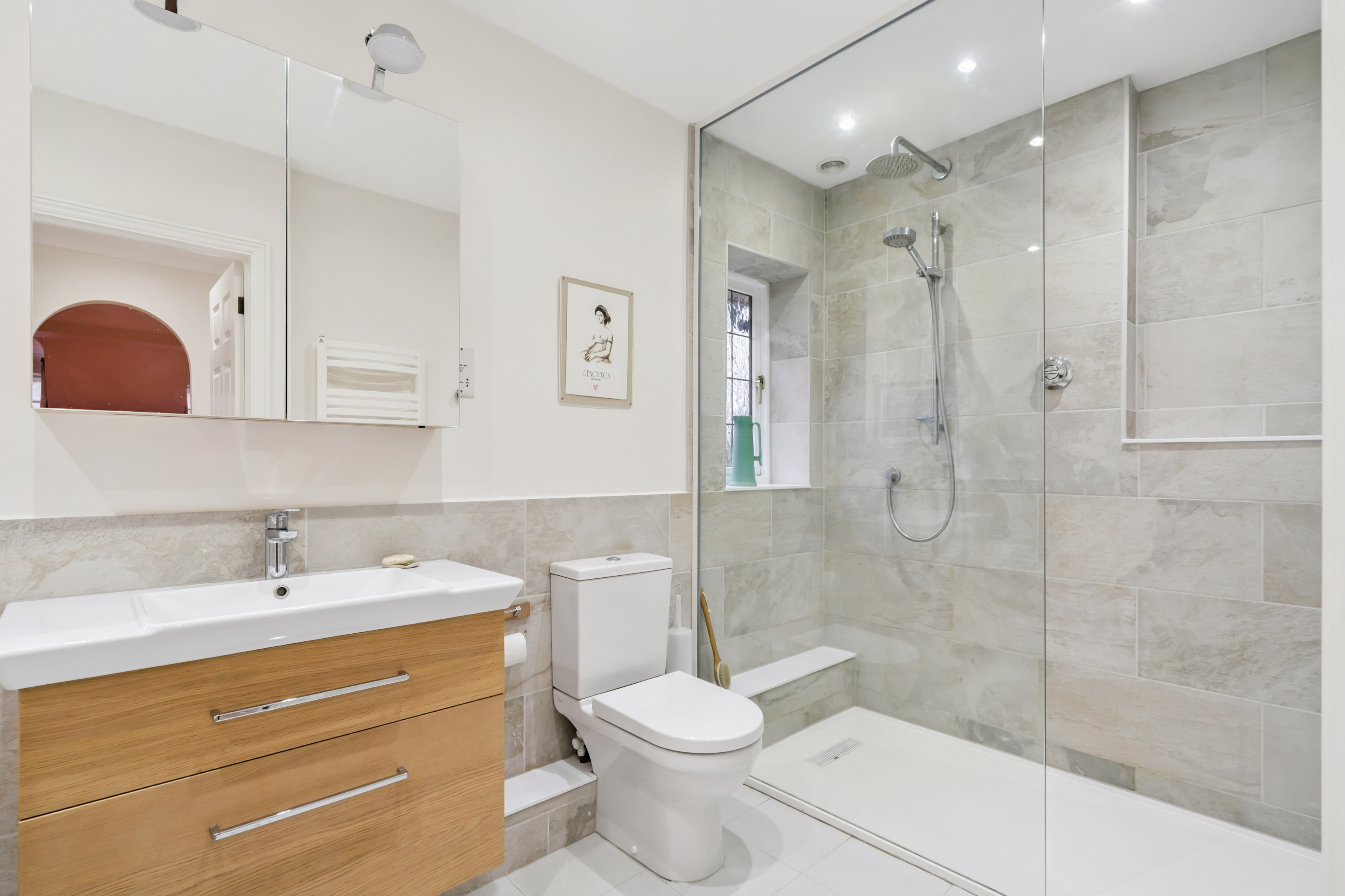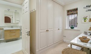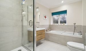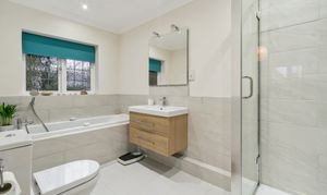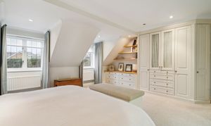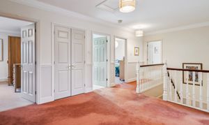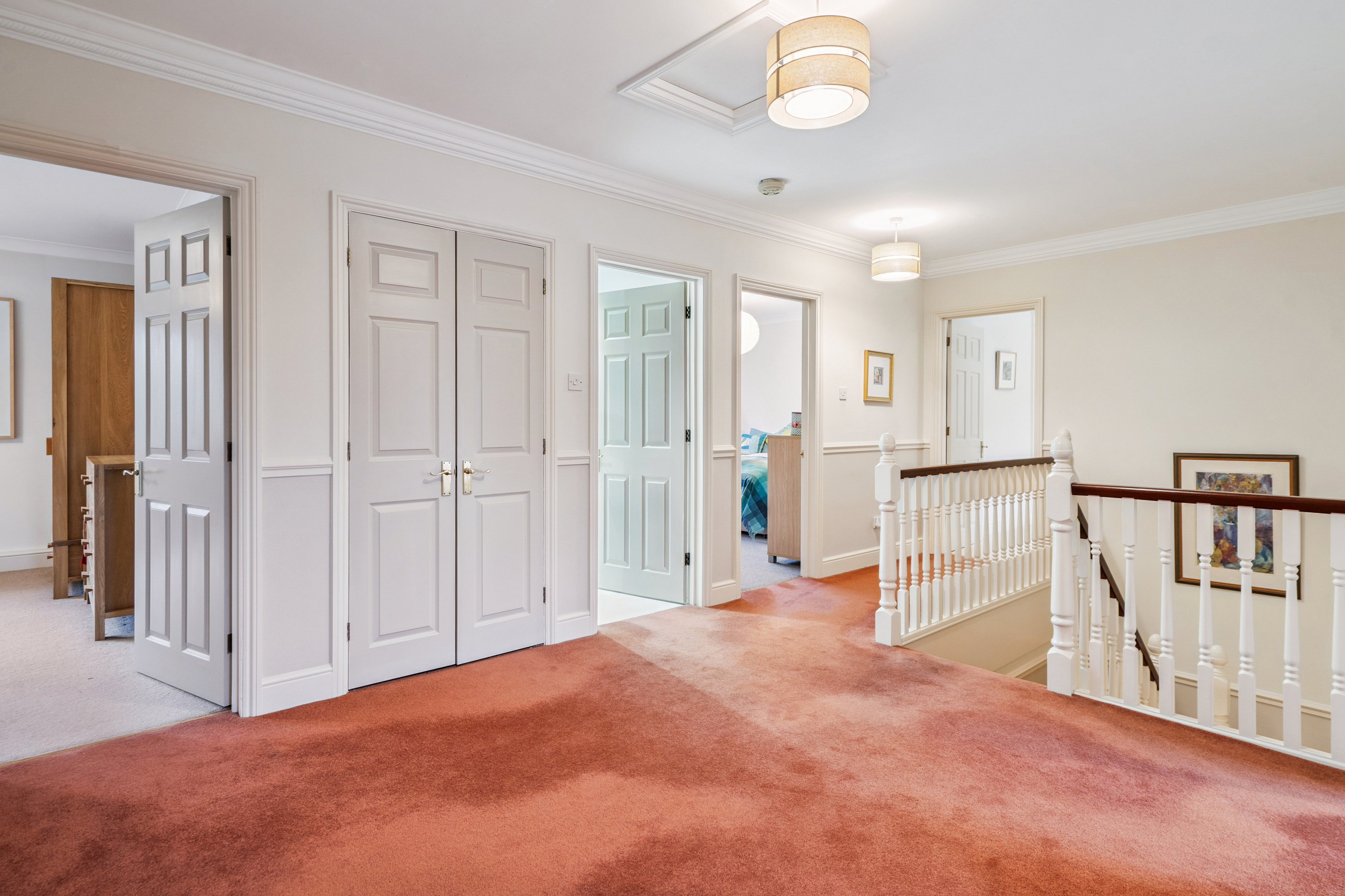 The first floor is arranged around a substantial landing. The impressive principal suite is a peaceful retreat featuring a large double bedroom with fitted storage, a dedicated dressing area with extensive fitted furniture and dressing table, and a luxurious en suite bathroom with bath, walk-in shower with overhead shower, floating vanity unit, heated towel rail and high ceilings. There are four further double bedrooms, including a guest suite with a beautifully tiled en suite bathroom comprising bath, separate shower, floating vanity unit, and WC. A large rear bedroom enjoys lovely views over the garden, and two additional bedrooms benefit from front or rear aspects. The family bathroom is stylishly fitted with a bath, separate shower, floating vanity unit and WC. A double cupboard on the landing houses the hot water tanks, alongside further generous storage, and there is loft access to a boarded and insulated loft space.