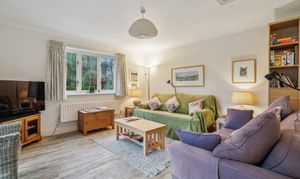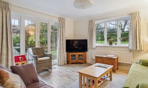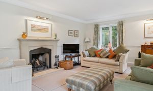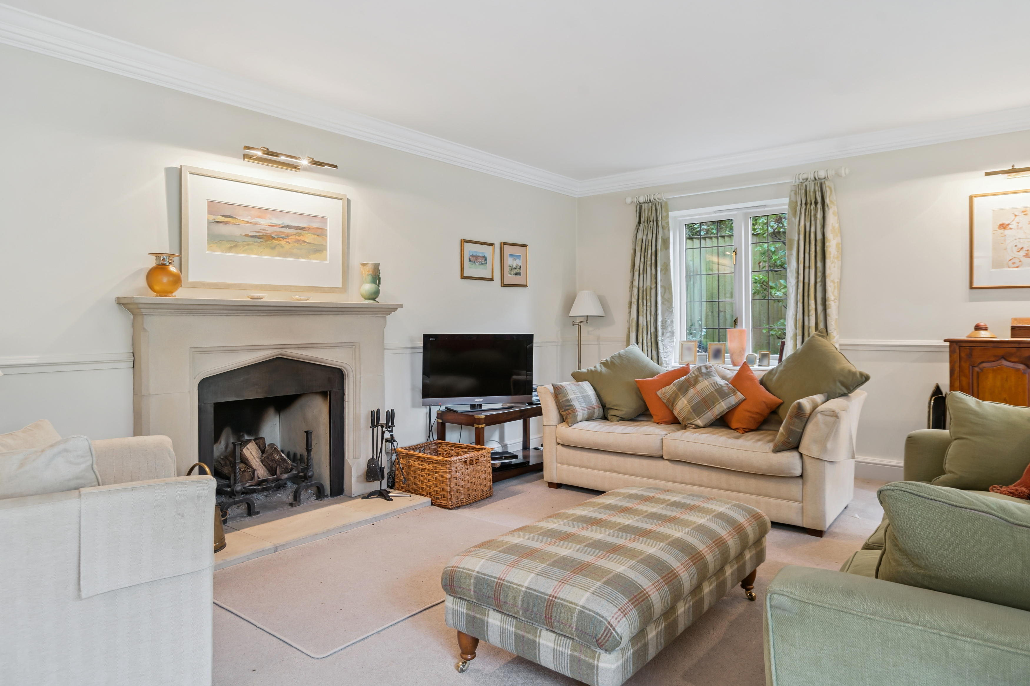The property is approached at the end of the cul-de-sac with a landscaped frontage, leading to a welcoming porch and spacious entrance hall. From here, glazed double doors open into the sitting room, a warm and inviting space featuring a characterful Bath stone open fireplace, French doors opening onto the rear patio, and a charming corner seating area overlooking the garden.
