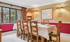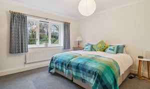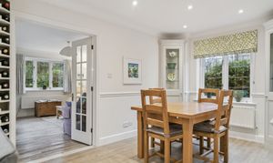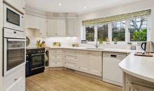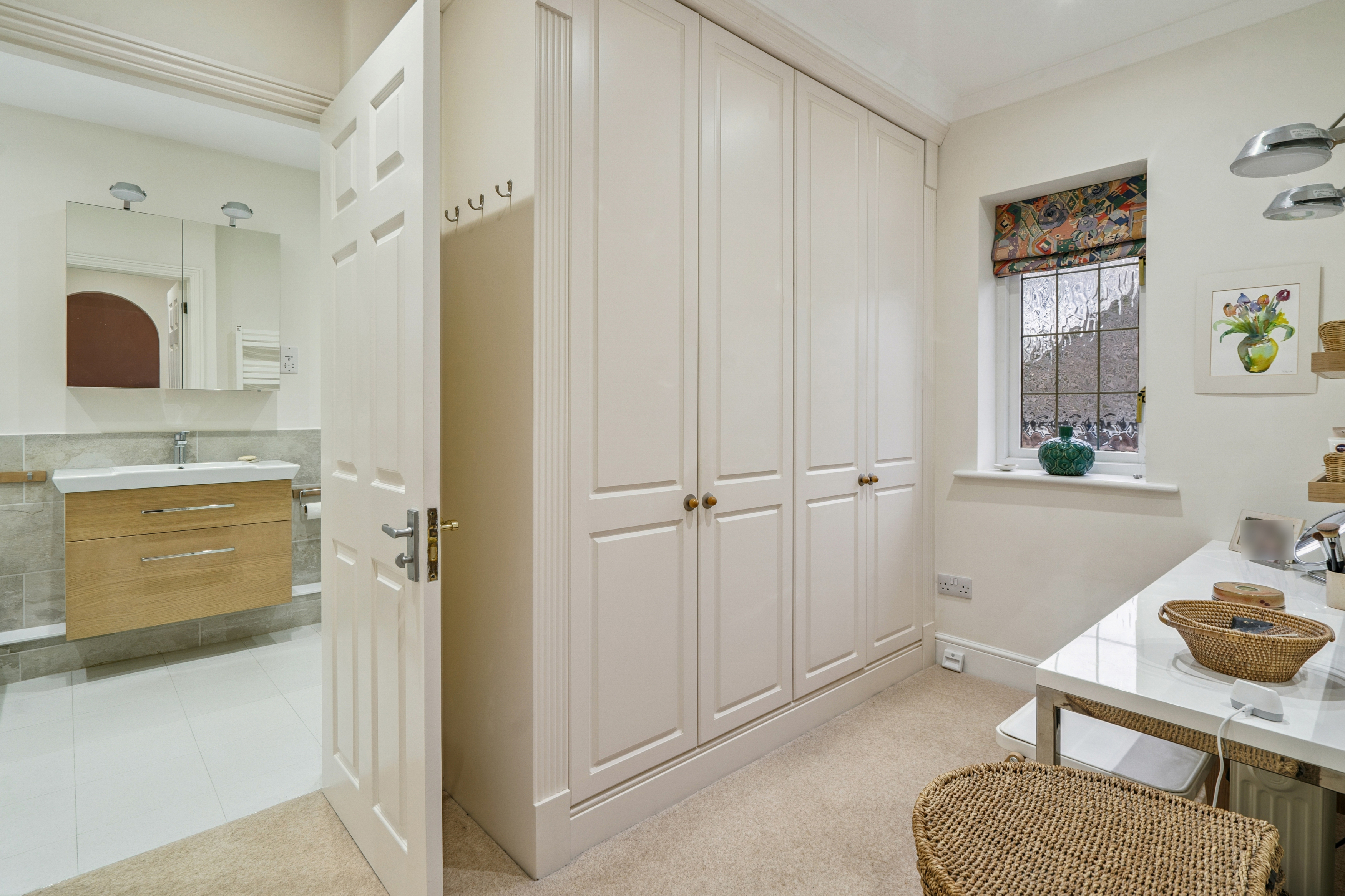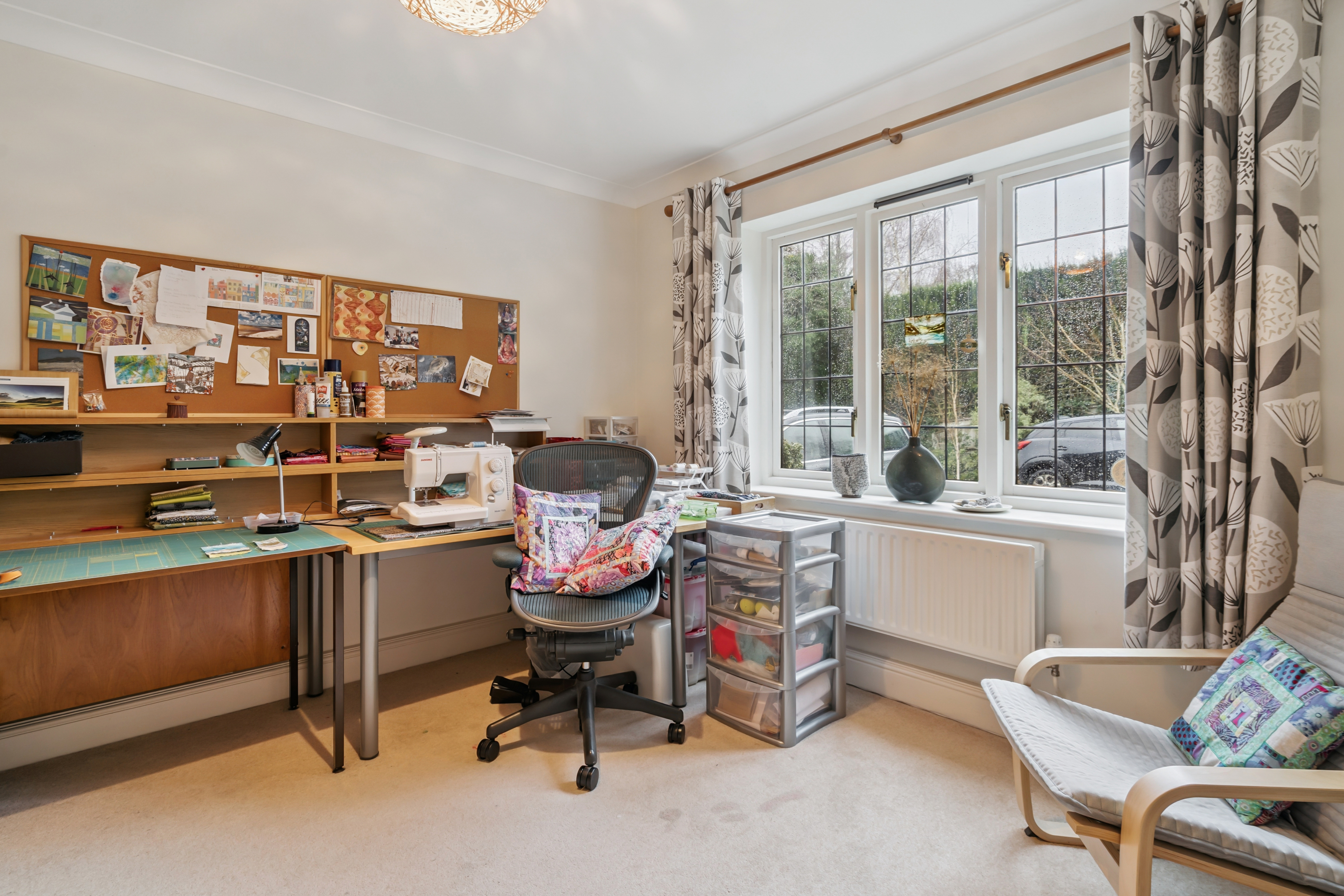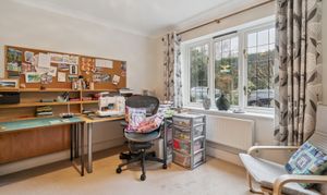 To the front of the property is a study, currently used as a hobby room, providing an ideal home office. The formal dining room sits opposite, enjoying pleasant views over the front garden and is accessed through double glazed doors. The kitchen, fitted approximately ten years ago, is well equipped with a Rangemaster cooker comprising twin ovens, grill and warming drawer, alongside a separate electric oven, space for a microwave, integrated fridge, dishwasher, twin sink with waste disposal unit and filtered water tap. A breakfast bar enjoys views over the garden and opens into a breakfast area with space for a full dining table. This flows into a family room with garden views and doors leading directly onto the terrace, creating a superb everyday living and entertaining space. A further door from the kitchen leads to a utility room with space for washing machine and tumble dryer, sink, water softener and additional storage. Beyond this is the original garage, now converted to provide two further rooms and additional storage space. It has it’s own separate entrance. The boiler, approximately nine years old, is also located within the garage area. A downstairs cloakroom completes the ground floor.
