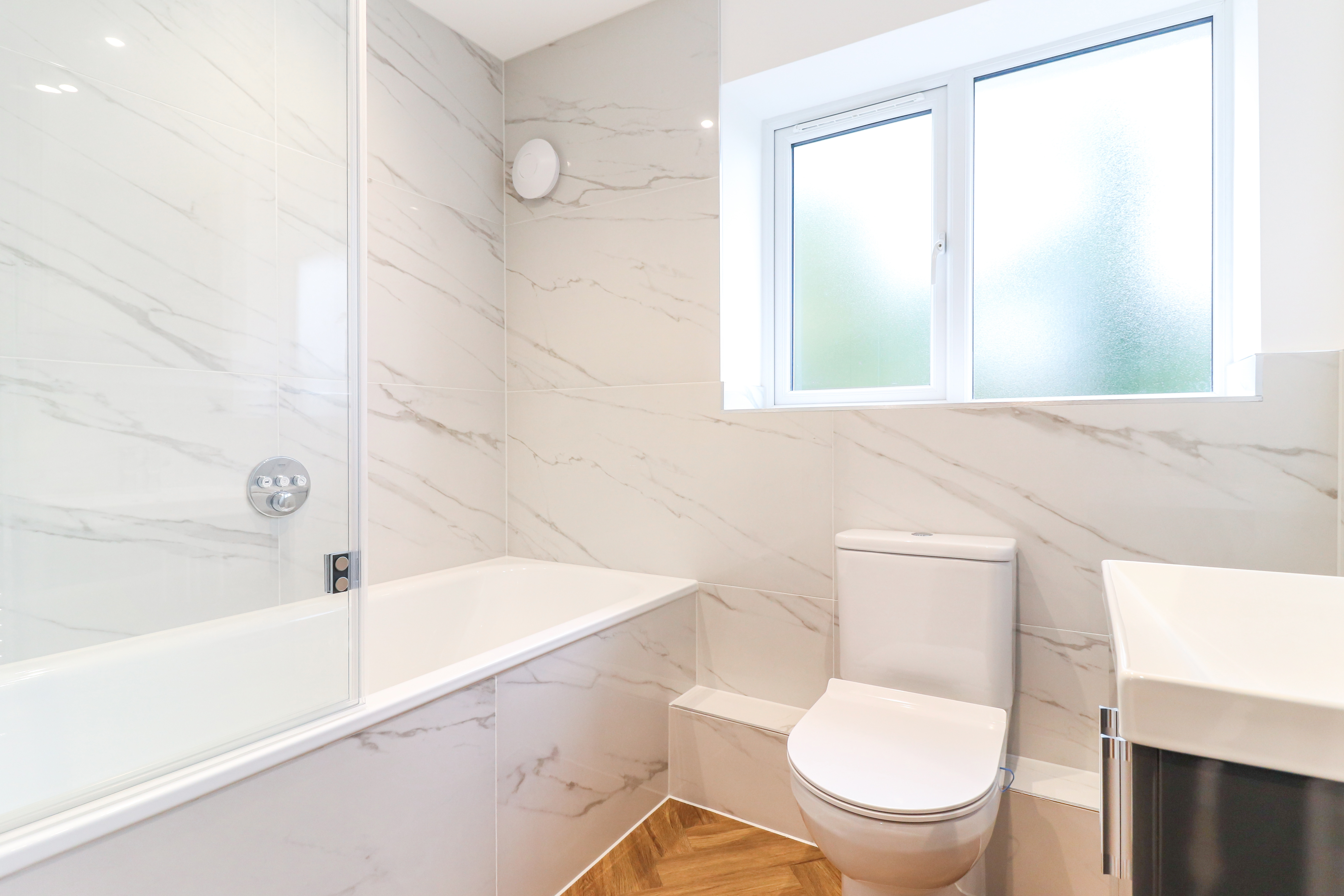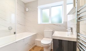 To the first floor, there are 2 double bedrooms and a family bathroom which has been fitted with stylish marble tiles. Stairs rise again to the first floor, where there is an additional double bedroom with W/C and large storage cupboard.