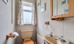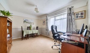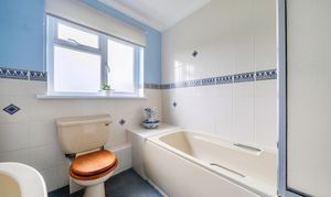 The kitchen/breakfast room has been fitted with a variety of traditional units with contrasting stone-effect worktops and finished with chrome-effect handles. Appliances include a double electric oven, ceramic hob with extractor over and space with plumbing for a dishwasher, washing machine and dryer. The dining room is currently being used as a study, ideal for those working from home. The family bathroom is fitted with a pale suite comprising panelled bath, with shower over, WC, and handwash basin.