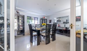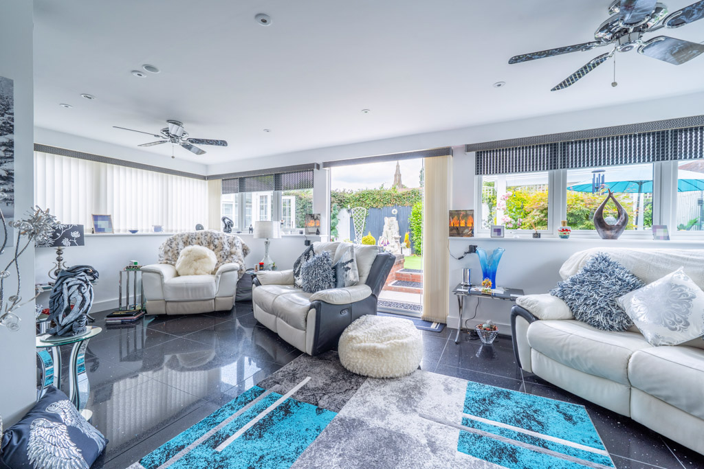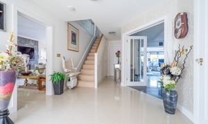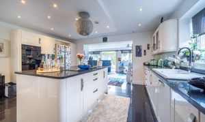 A grand reception hallway sets the tone for the spacious, elegant interior. The light filled sitting room features bi-fold doors to the garden, a feature fireplace with remote controlled LPG fire, and a calm, refined feel. A formal dining room and bright garden room provide flexible entertaining spaces, while the showstopping Shaker-style kitchen offers a central island, integrated appliances, wine storage and a striking crystal glass extractor, ideal for buyers seeking a modern, high-end kitchen.