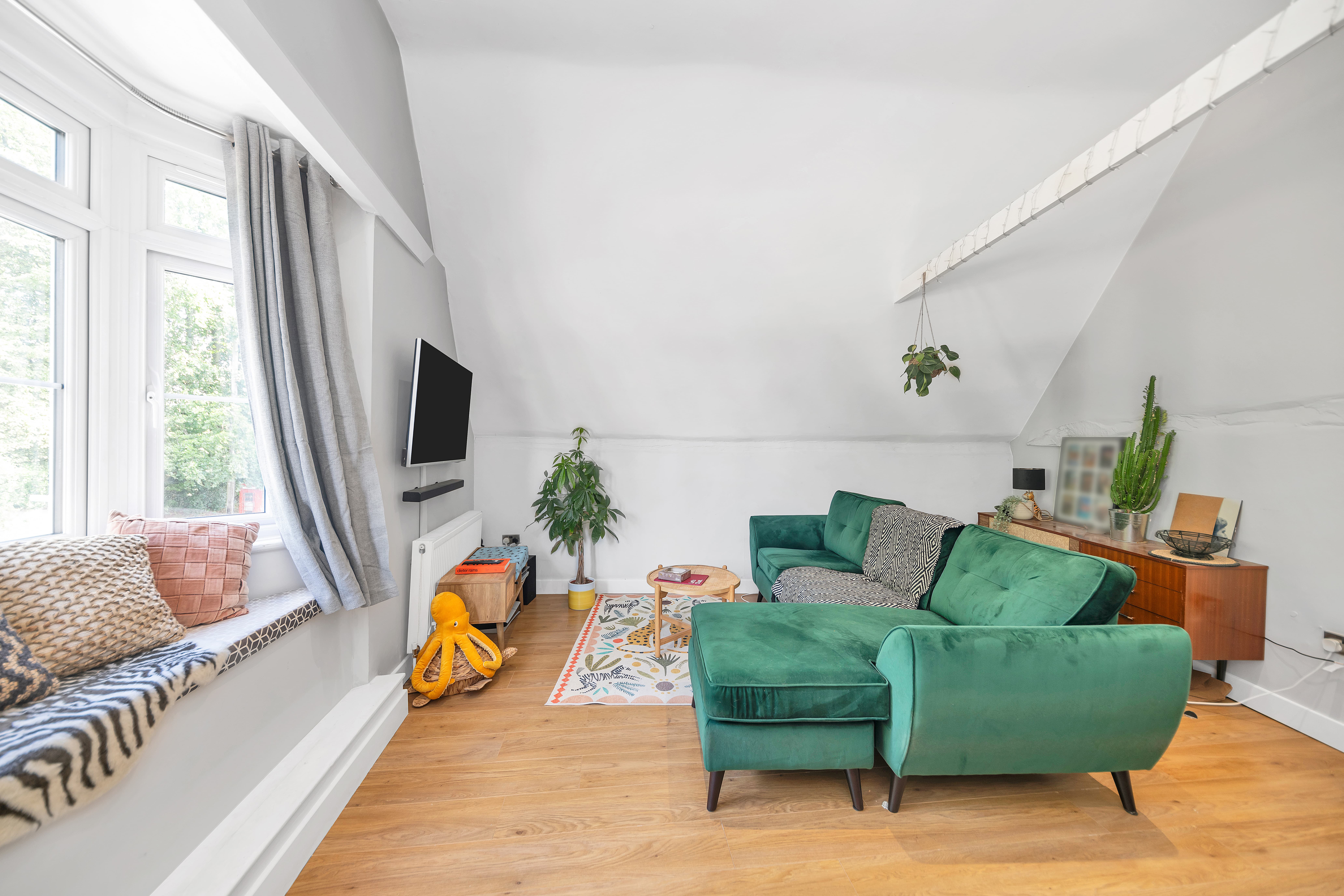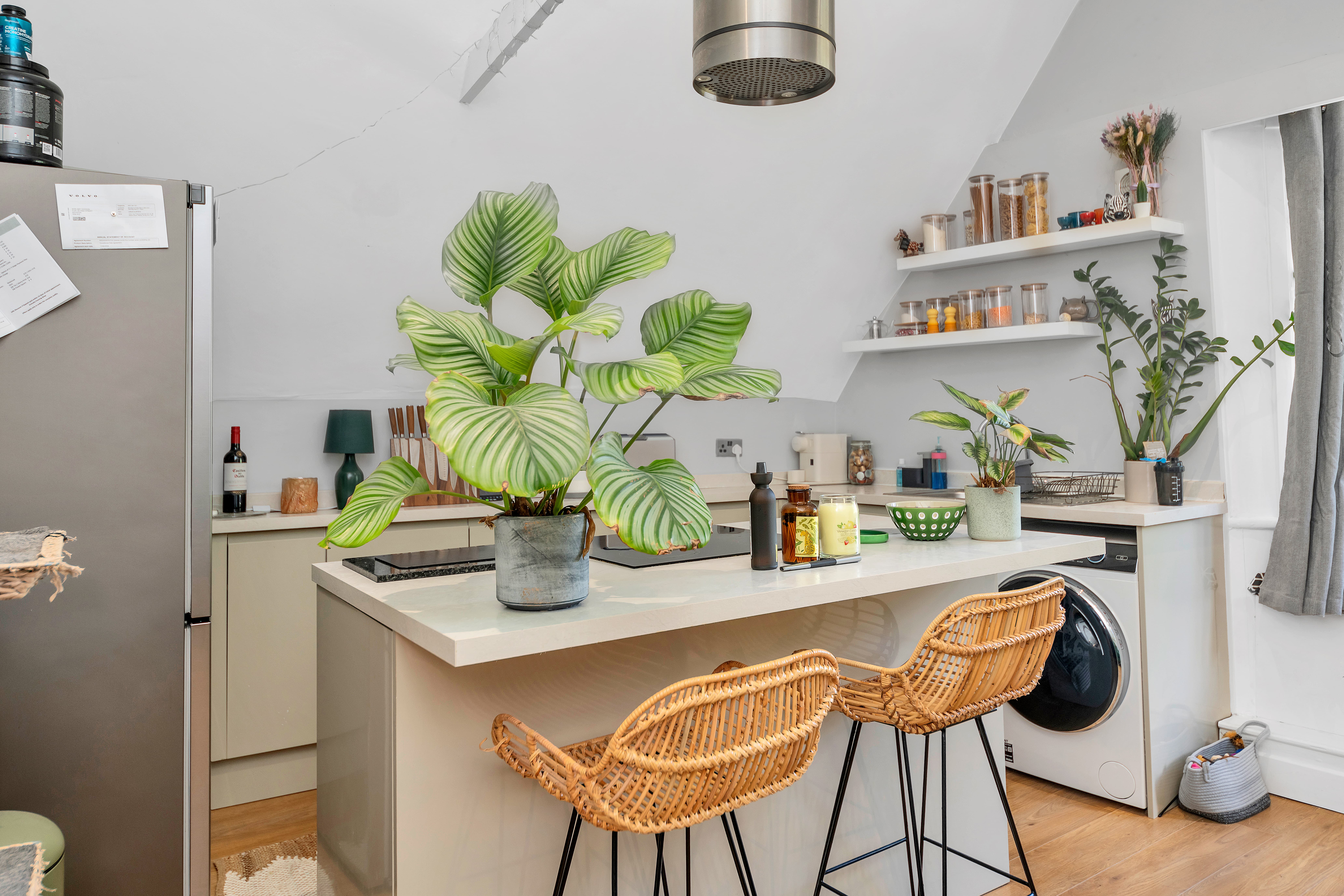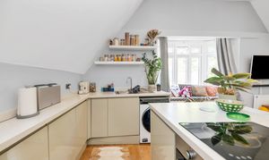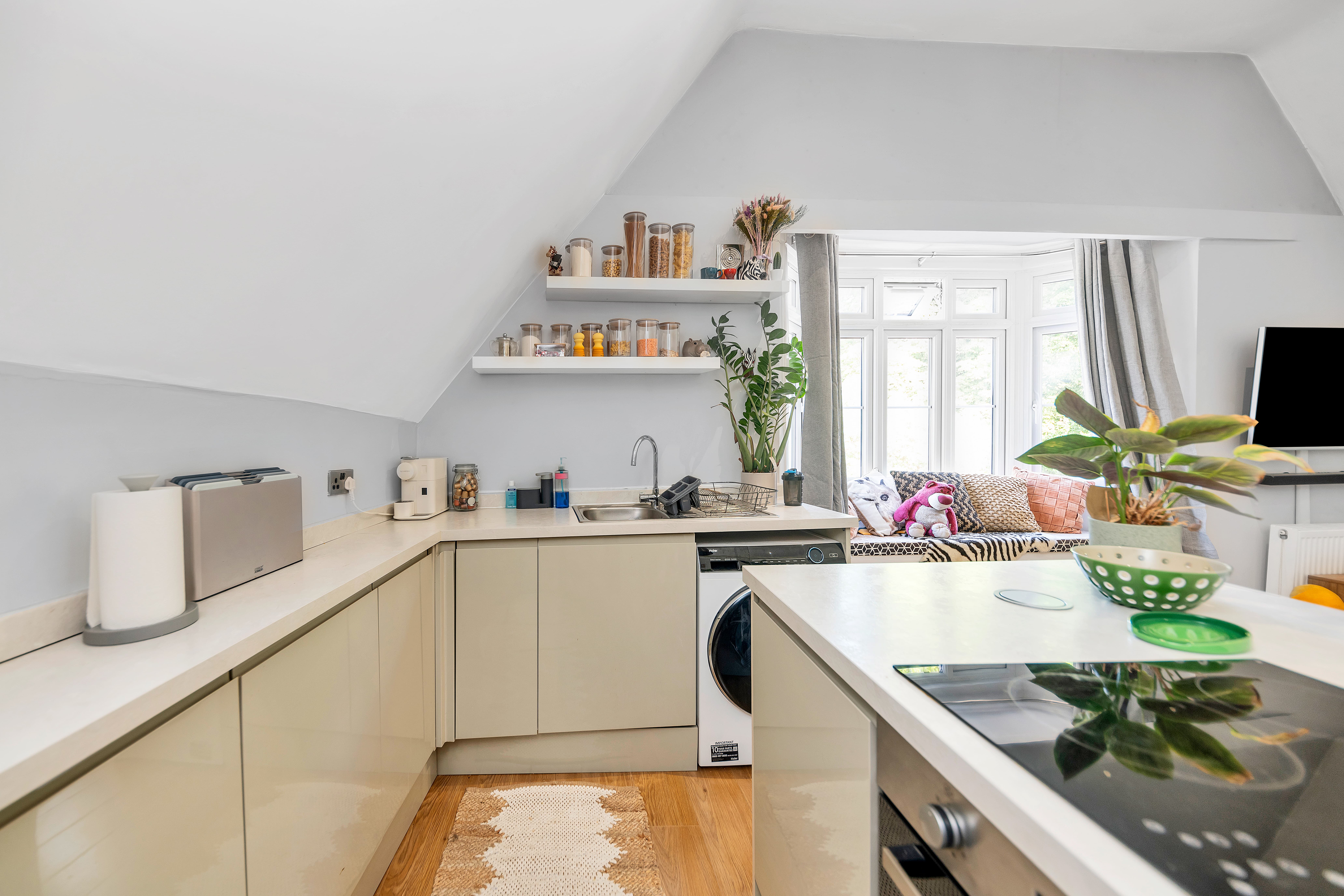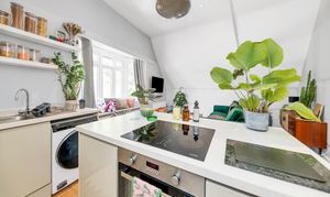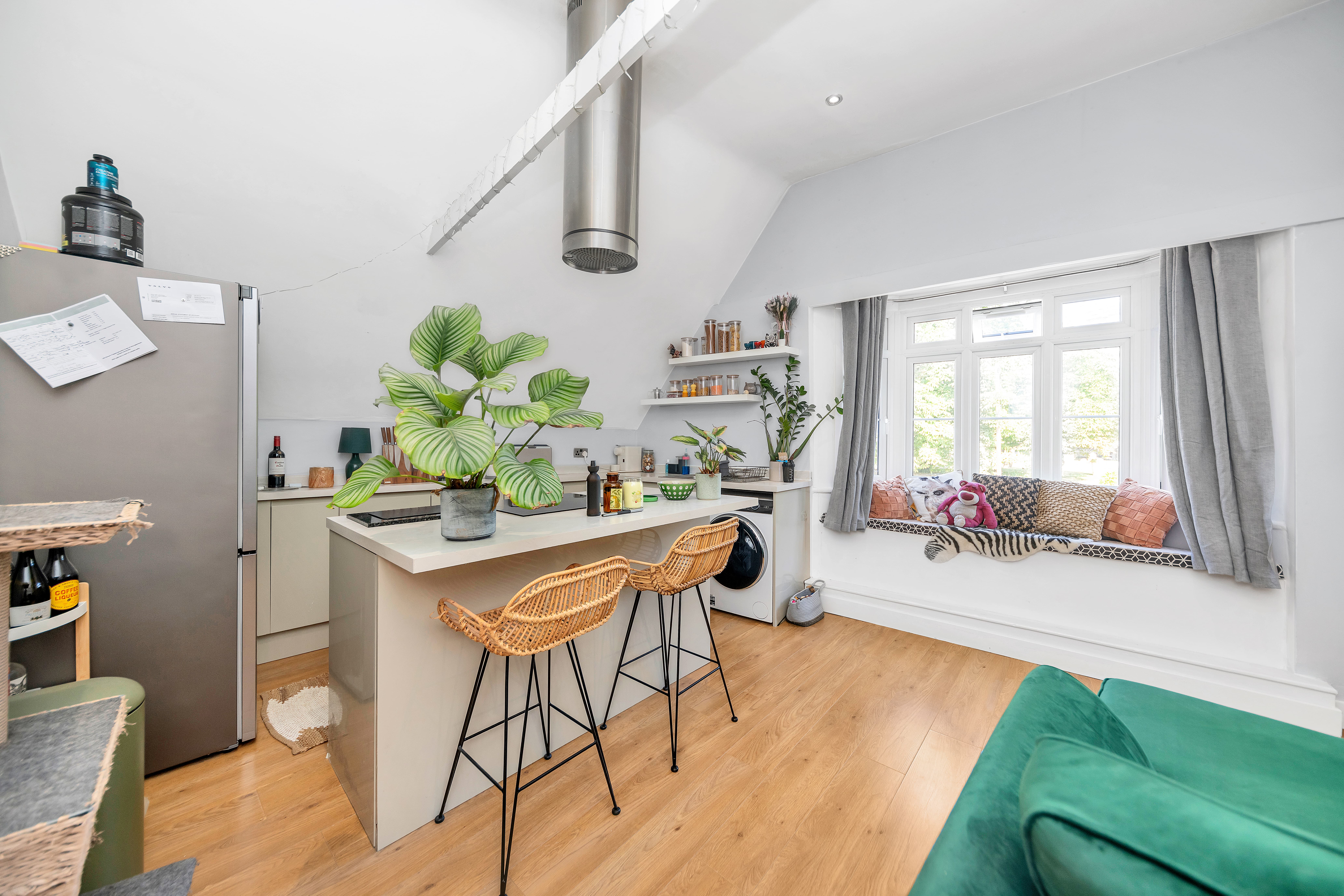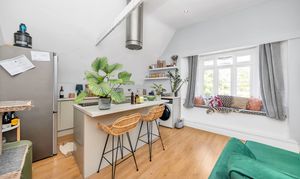The kitchen/dining/living room is a wonderfully open-plan space, benefiting from a bay window to a front aspect with a window seat, high ceilings, wood flooring, inset lighting, and lots of space for lounge, dining and storage furniture. In the kitchen area, there is a range of modern base units, an island/breakfast bar, laminate worktops, an extractor unit, an integrated oven and hob, and space for a washing machine, fridge/freezer and other small kitchen appliances.