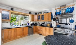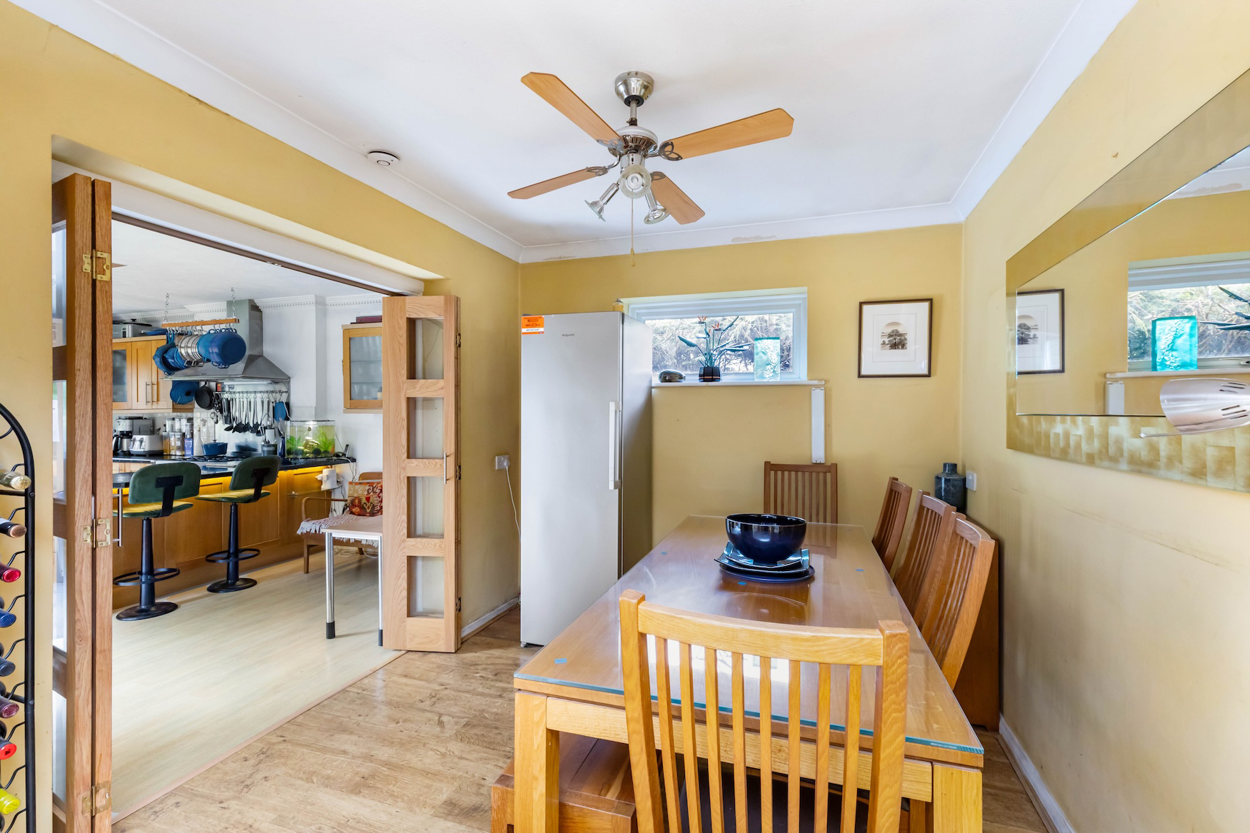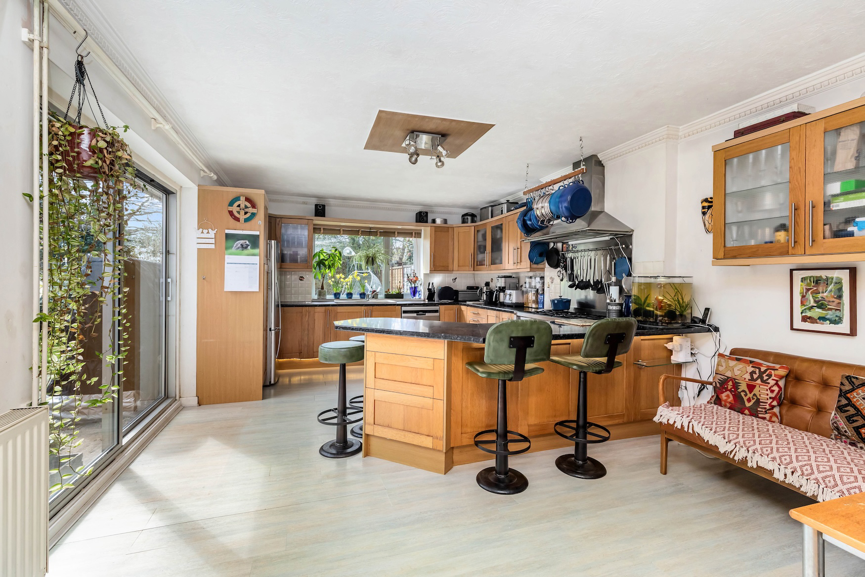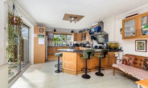 A pair of interconnecting doors lead into the kitchen/breakfast room fitted with an attractive range of units, space for appliances, breakfast bar that seats four and sliding doors out to the garden.