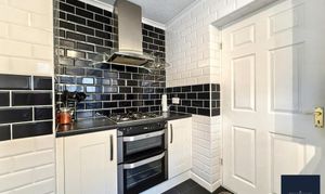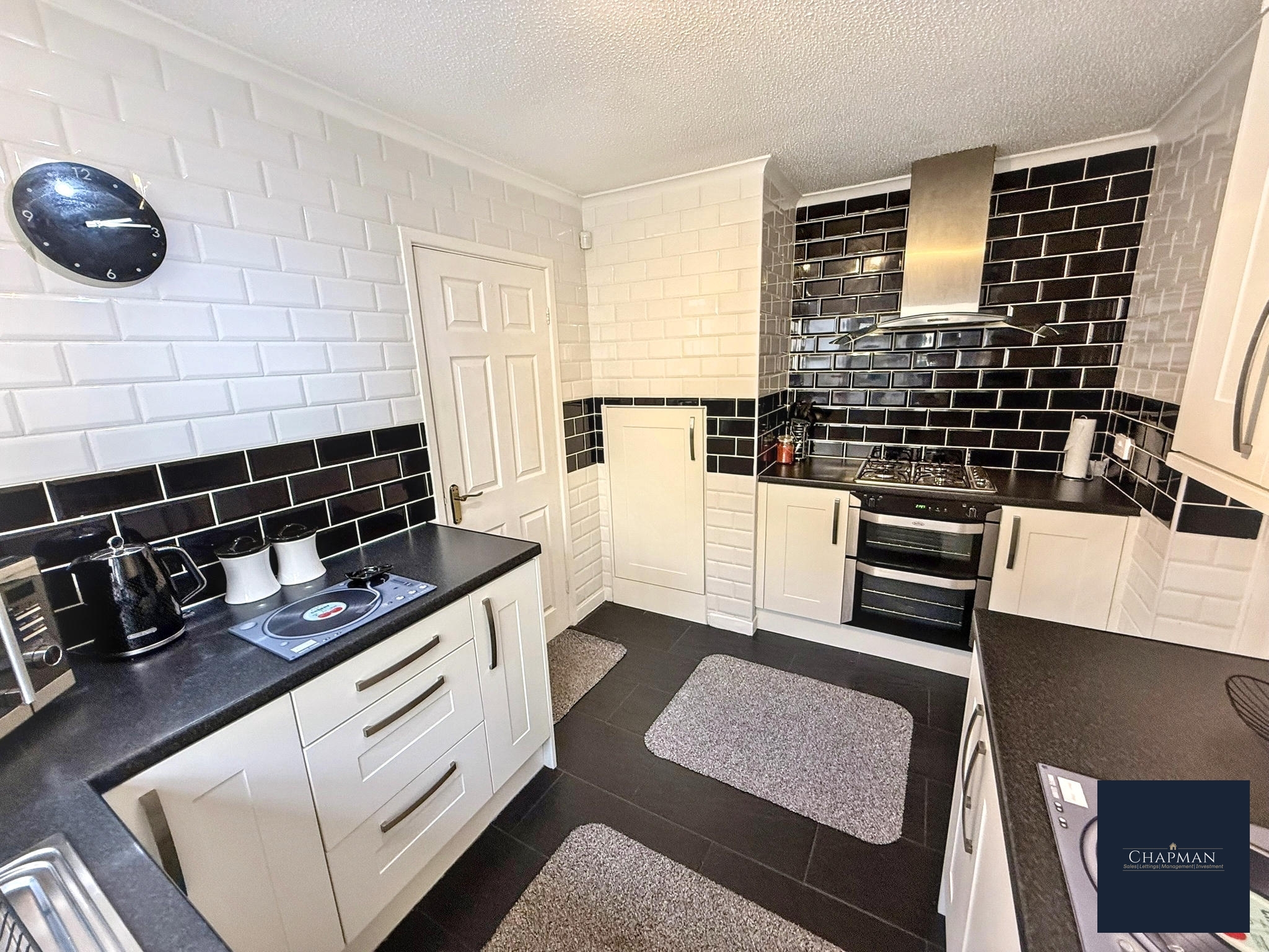 The sleek, contemporary kitchen is equipped with integrated appliances, striking black and white tiled backsplash, a gas hob, and a stylish extractor fan. The dining area is ideal for family meals and entertaining guests, enhanced by neutral tones and easy access to under-stair storage.