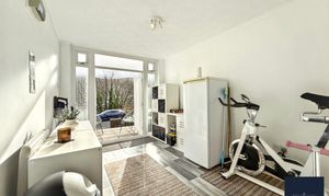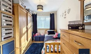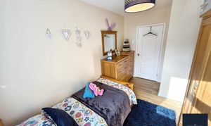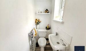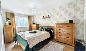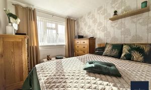 Upstairs, each bedroom is bathed in natural light, showcasing elegant decorative touches such as feature wallpaper, textured ceilings, and ample built-in storage with charming wooden furniture and wardrobes. The modern bathroom suite provides a relaxing retreat, with a sleek white finish, heated towel rail, large window, and decorative shelving for added comfort.