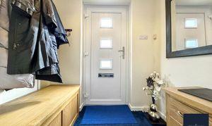 Additional features elevate this property’s appeal and functionality. The welcoming entrance hall boasts a modern front door, practical coat storage, and a wooden bench, setting a warm and stylish tone as you enter.