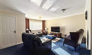 The property features a spacious and inviting open plan living area, flooded with natural light from large windows and complemented by plush carpeting and modern decor.