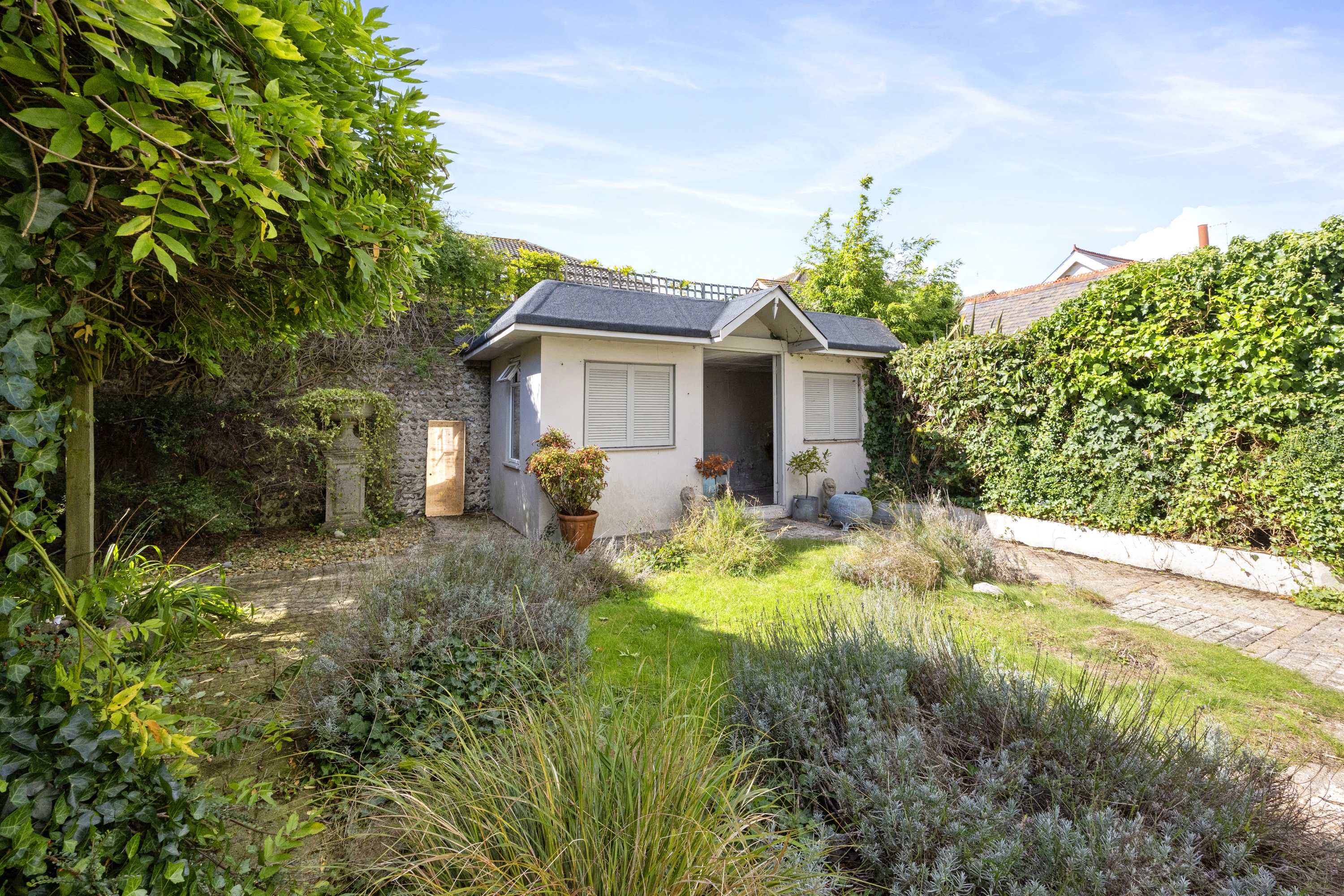 The back garden hosts a picturesque summer house, as well as an exceptionally large garden studio/annexe. This is a truly special find as it also includes a kitchen, WC and has a shower plumbed in. There is huge potential for this space to cater for work or recreational purposes.