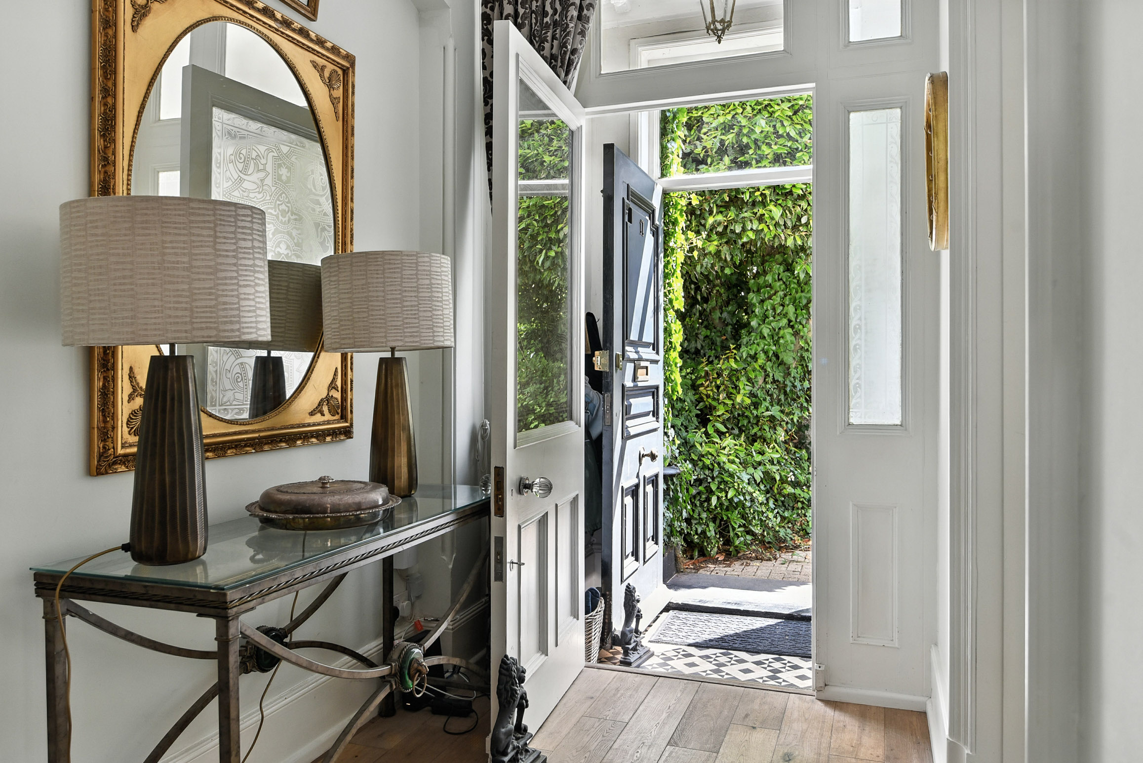 A leafy front garden leads you to the large original front door, which opens into an entrance porch with original floor tiles. The porch leads into a wide hallway offering views through to the bright kitchen to the back of the property, and the large reception rooms to the right.